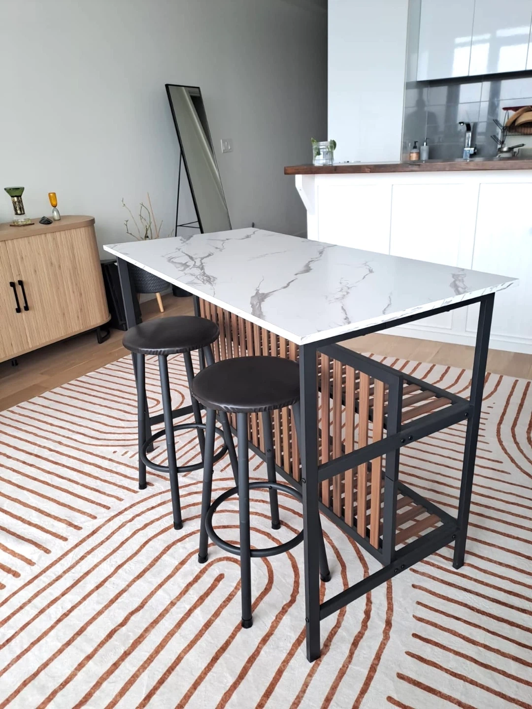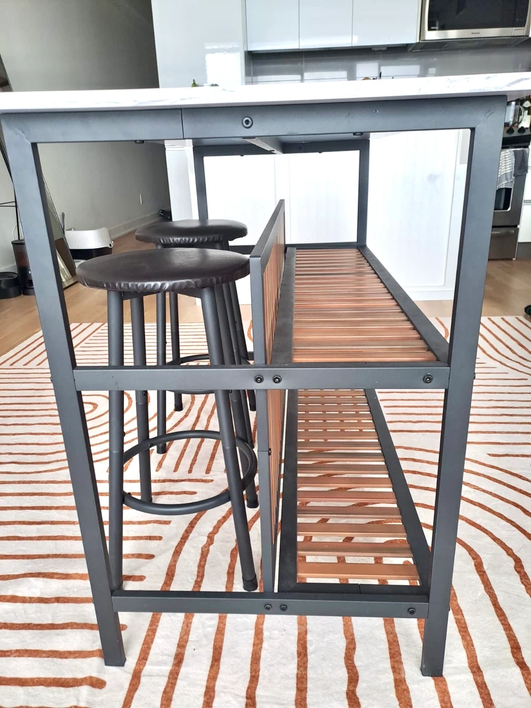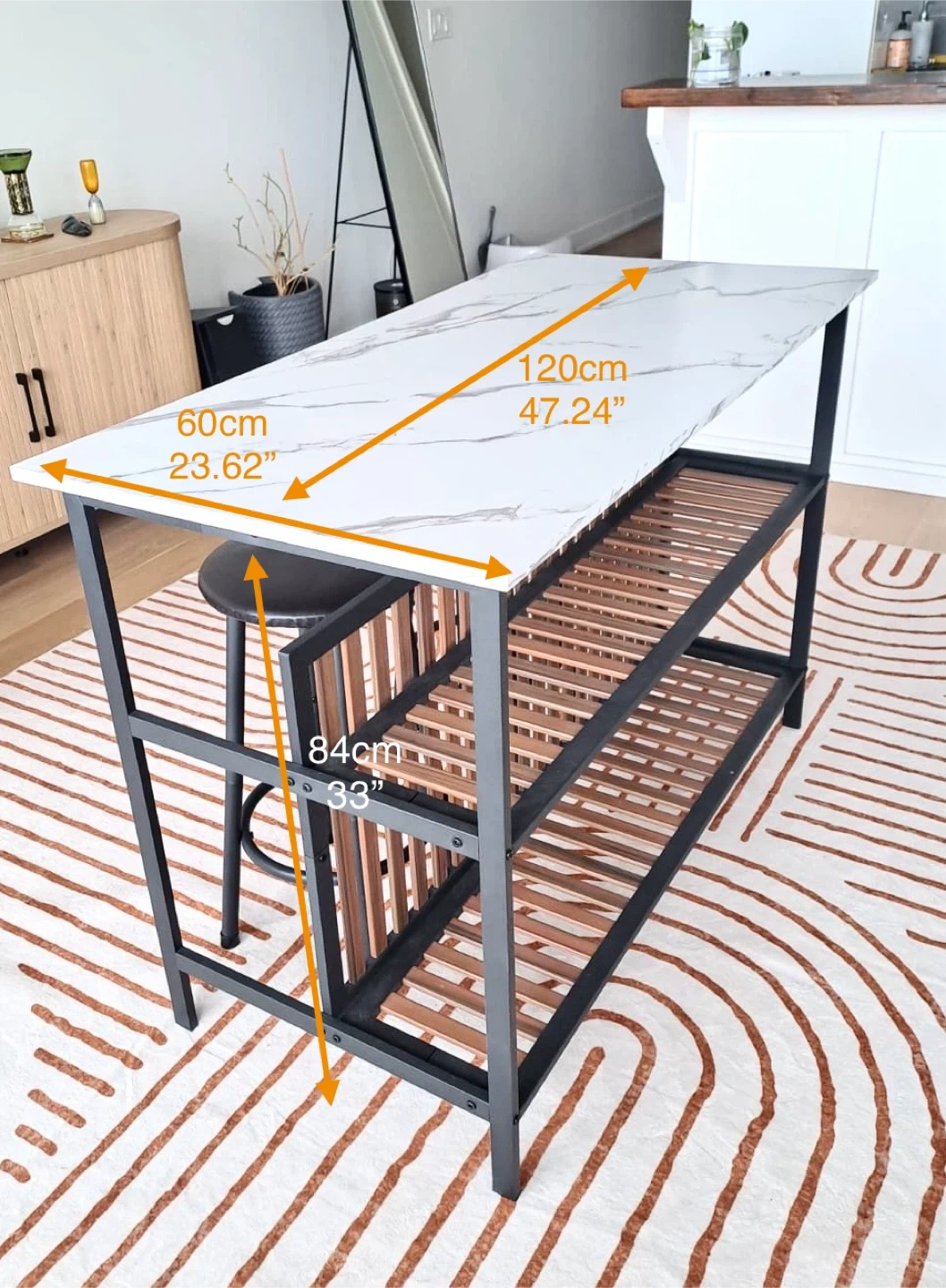 Marble-look countertop and two slatted shelves for storage. Two black stools are included. This setup is perfect for smaller kitchens or apartments needing extra counter and seating space! Very light tables, can be moved according to your needs.