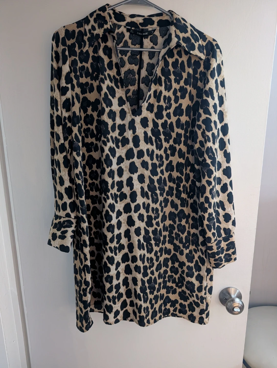 This is a Zara Basic dress with a leopard print pattern. It's a collared V-neck style with long sleeves. The fabric appears to be a lightweight, flowy material.