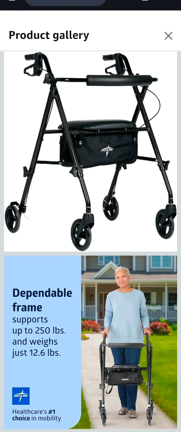 This is a Medline Superlight Folding Aluminum Mobility Rollator Walker, designed for adults. It weighs just 12.6 lbs but supports a weight capacity of up to 250 lbs. It has ergonomic easy-to-use brake handles and height-adjustable seat and handles. The frame is foldable for easy transport.