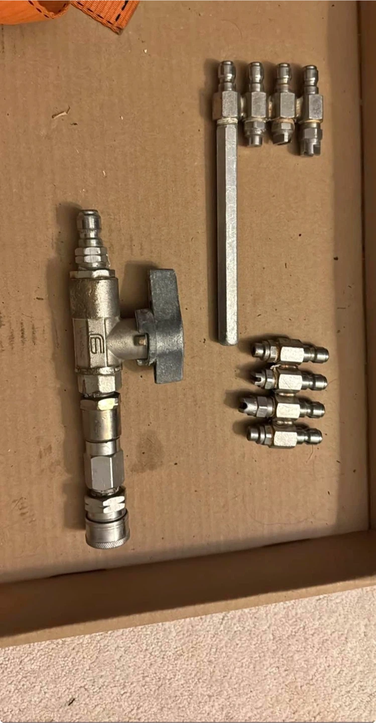 This set includes a pressure washer wand with a handle, a quick-connect fitting, and multiple spray nozzles. It's made of durable metal construction. These are great for various outdoor cleaning tasks!