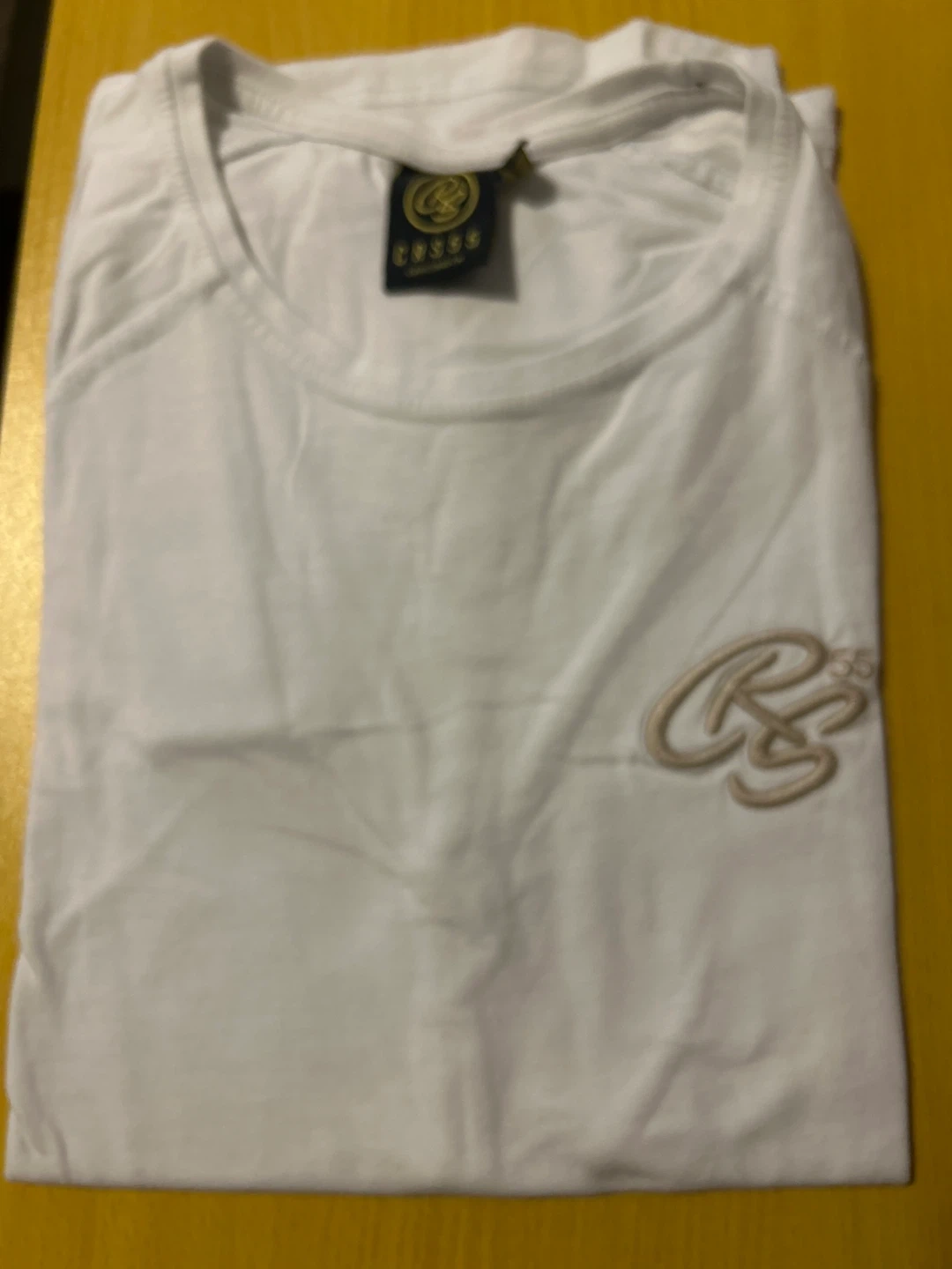 This is a white CRS55 t-shirt. It's a size medium. The shirt's made of cotton.