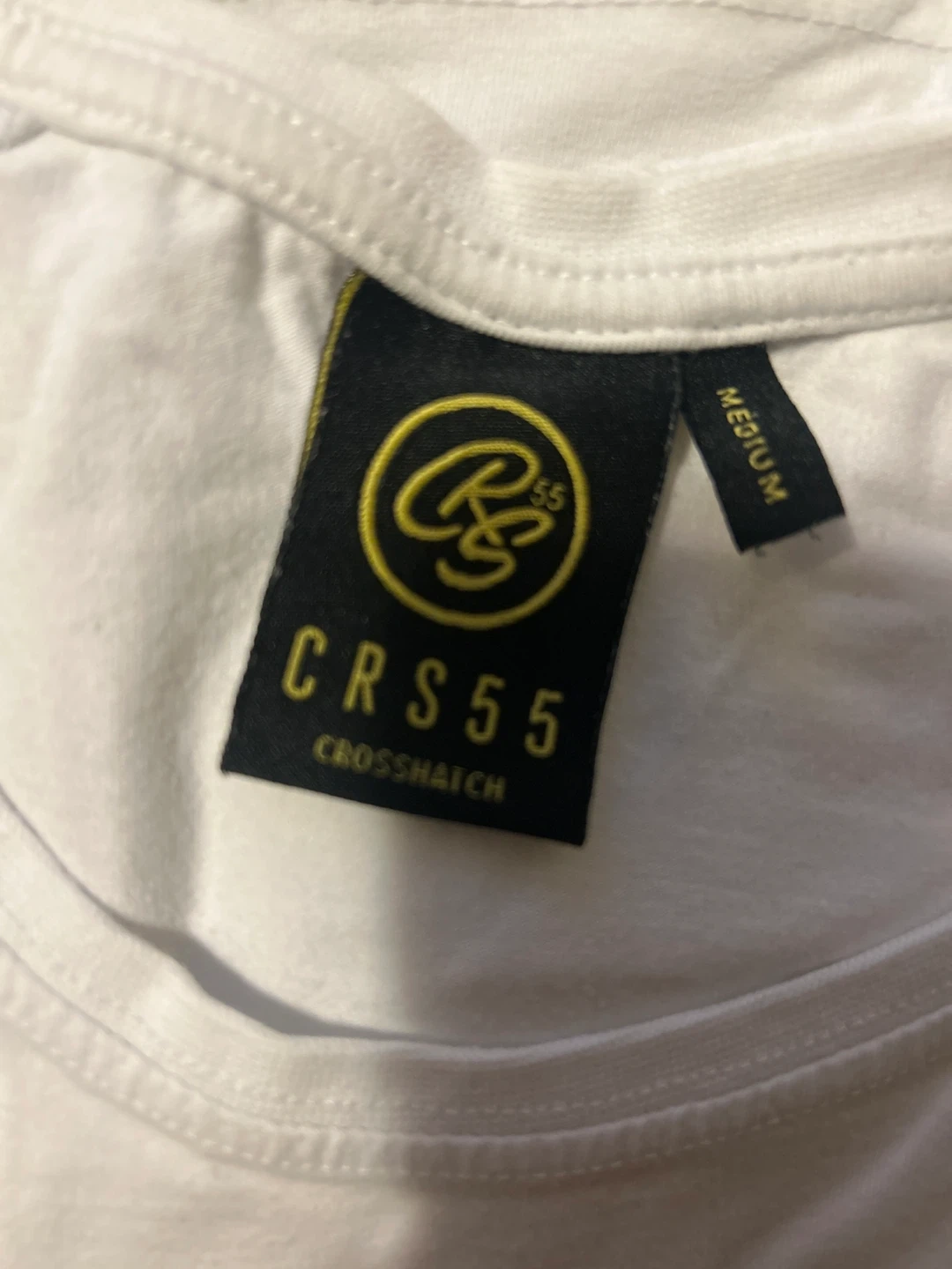 This is a white CRS55 t-shirt. It's a size medium. The shirt's made of cotton.