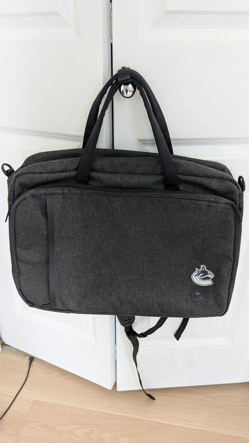 This Herschel duffle backpack features a cool Vancouver Canucks team logo lining. It's a versatile bag for travel or everyday use. It has multiple compartments for organization.