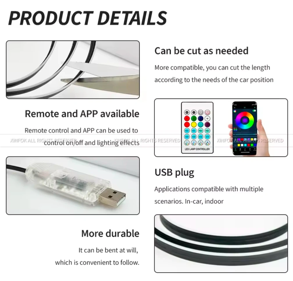 RGB LED Car Interior Strip Light APP, RF Remote and USB Control