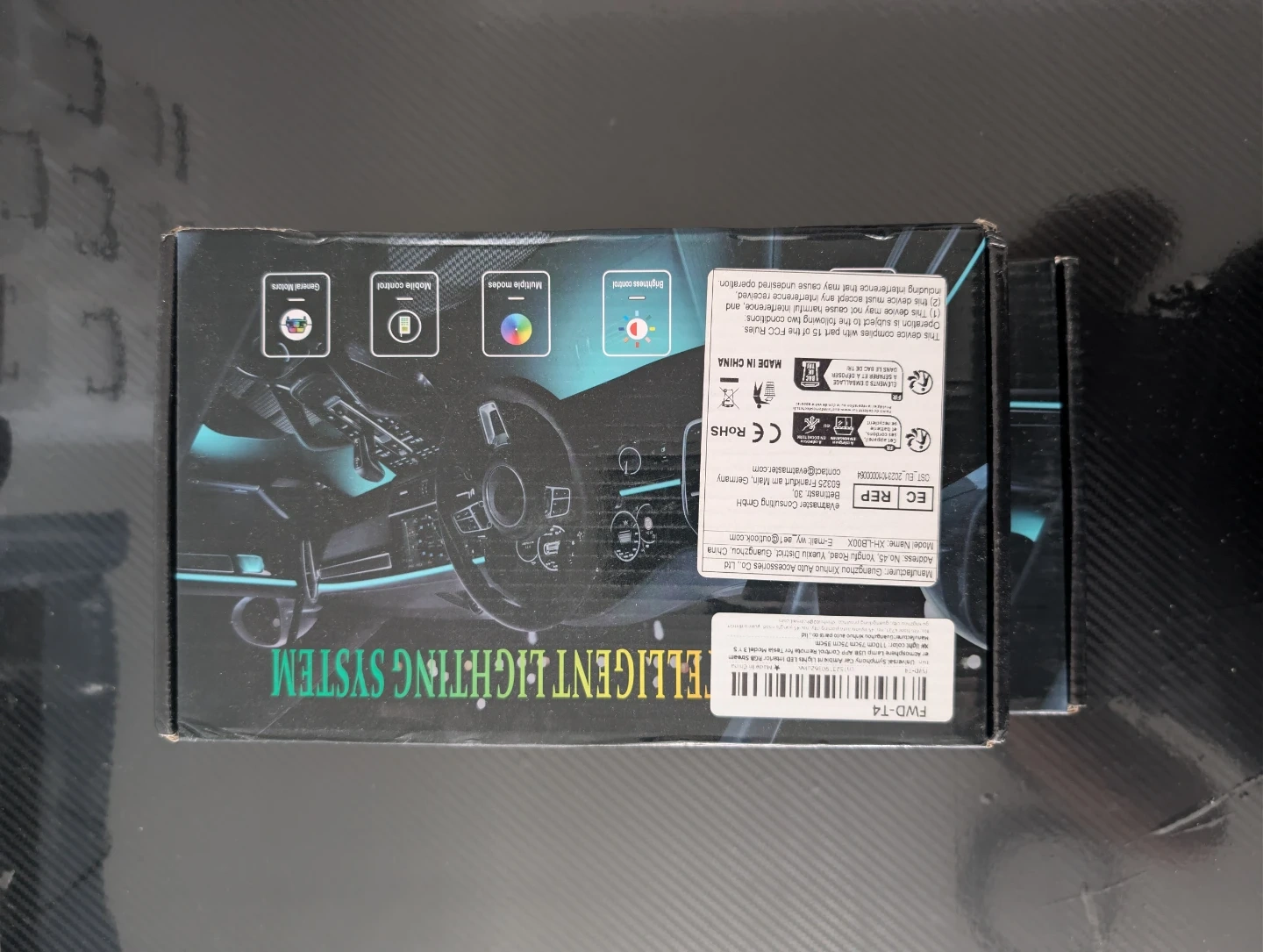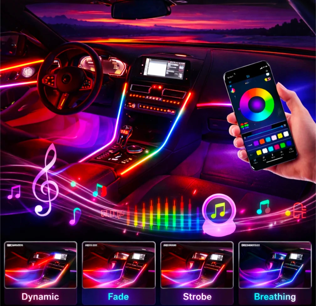 The system offers three control options: mobile app control for full customization, RF remote control with up to 10 meters range, and USB button control for simple operation. Advanced functions include dynamic start scan effects, DIY modes, memory function, timing, music synchronization, and voice control, making it ideal for daily driving or car customization.