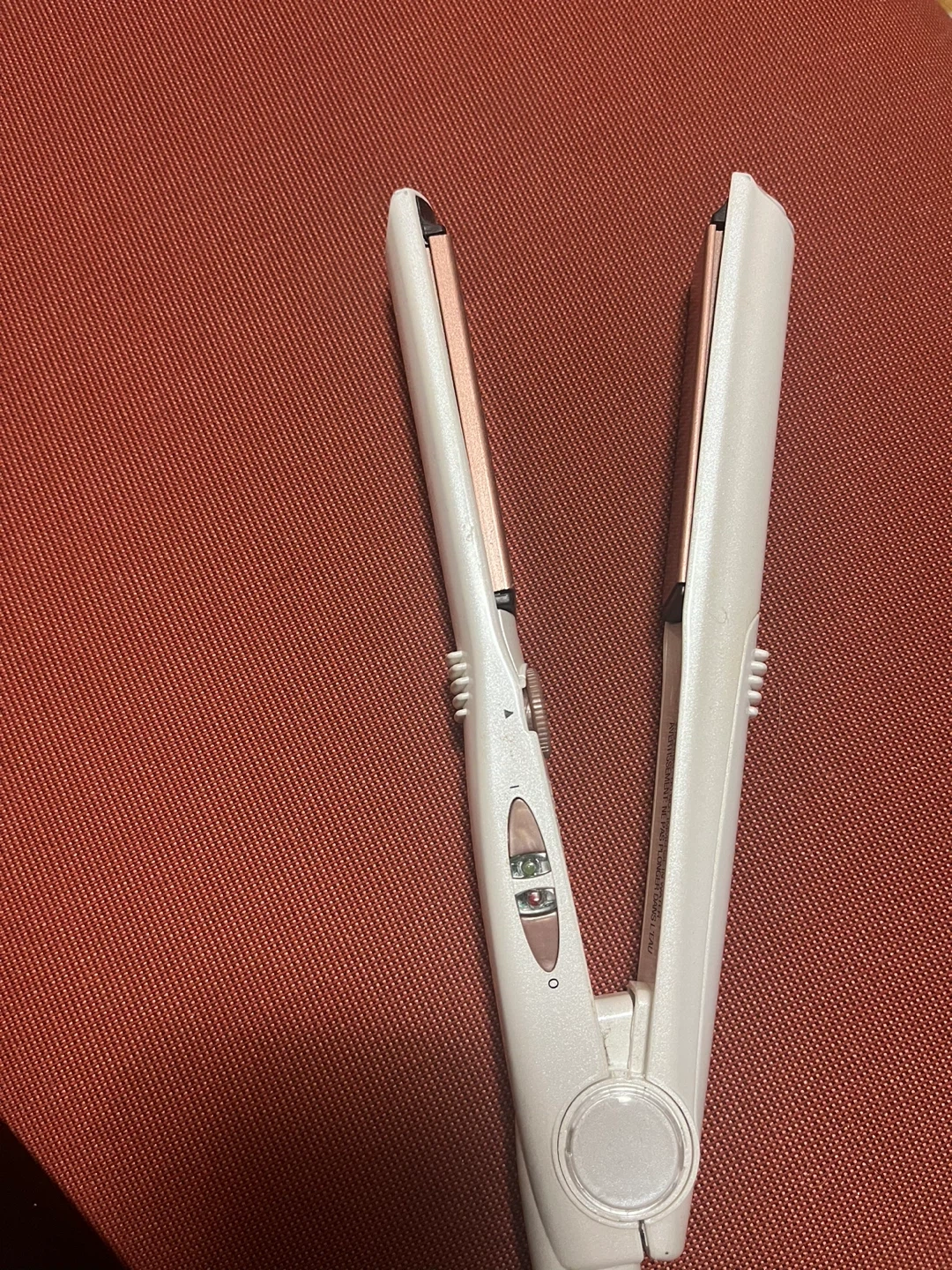 This is a Quo hair straightener with rose gold plates. It features adjustable temperature settings. It's suitable for styling hair quickly and effectively.