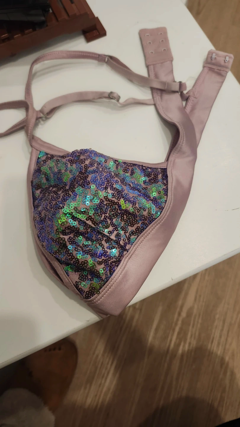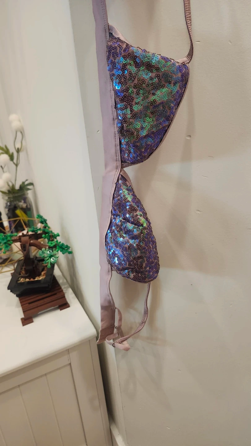 Sparkly sequined bikini top in a soft lavender shade. It features adjustable straps and a clasp closure for a custom fit. Perfect for adding some shimmer to your beachwear or festival outfit!
