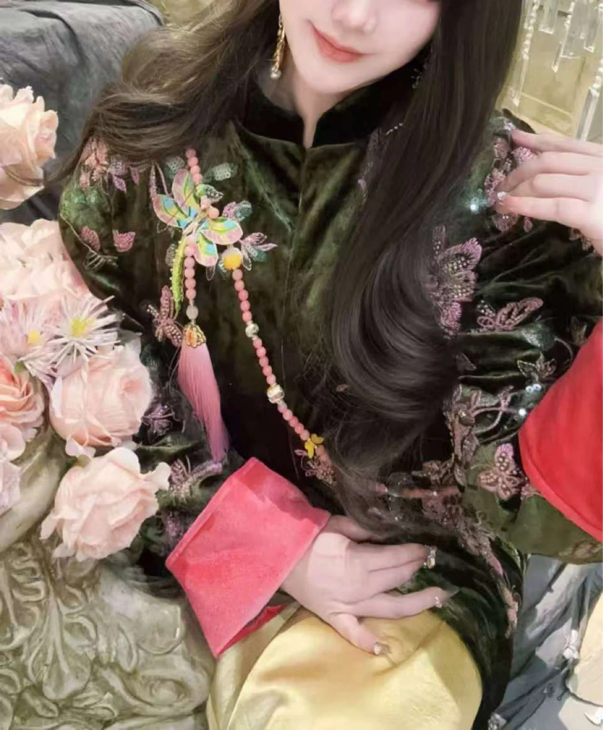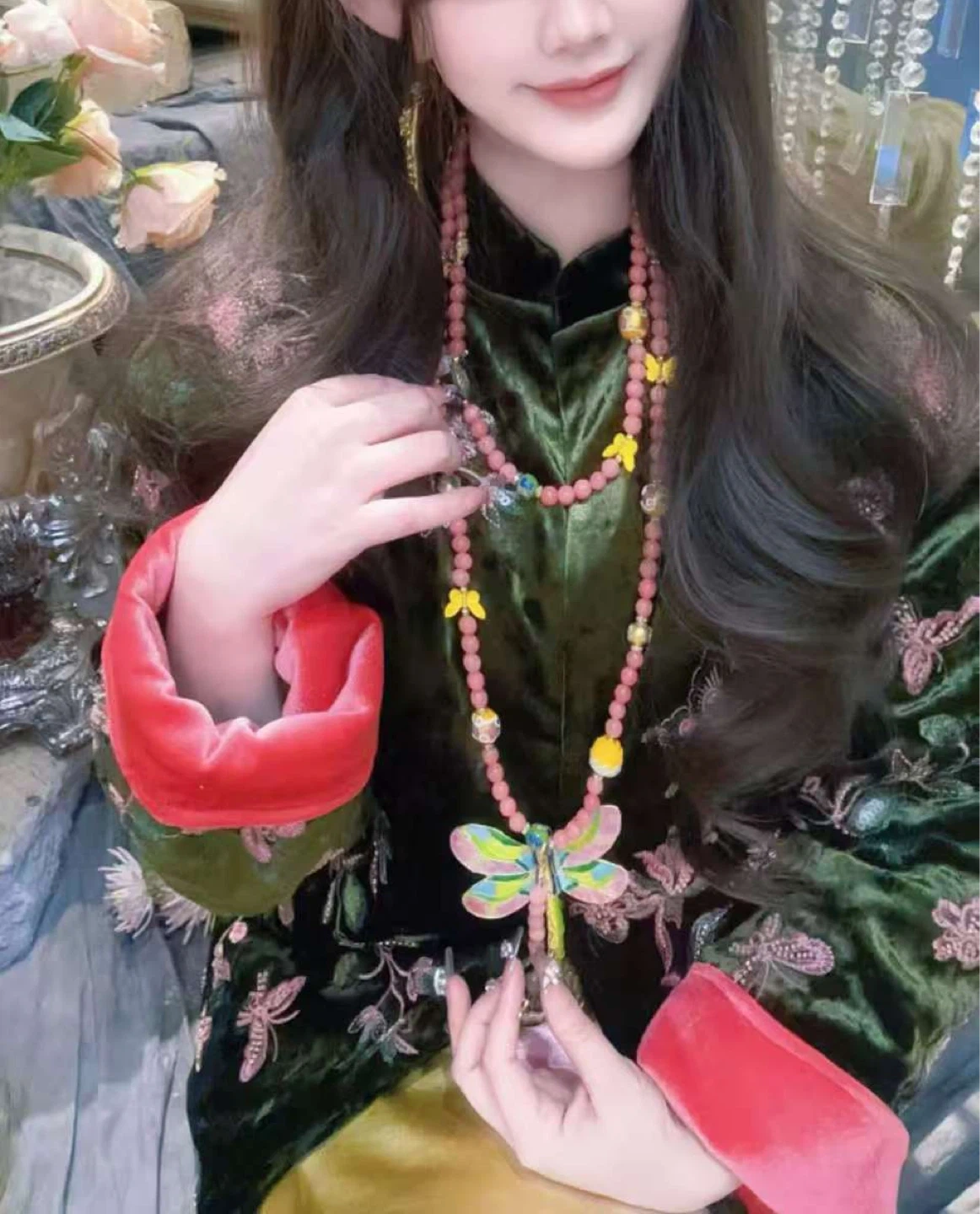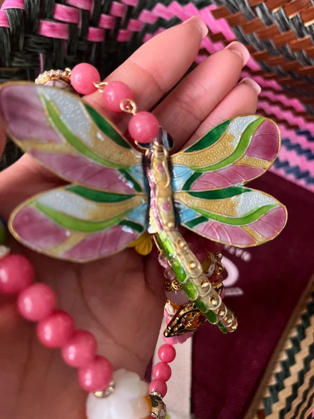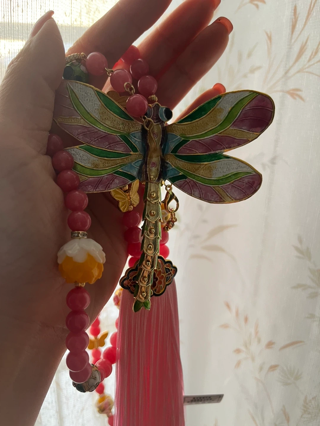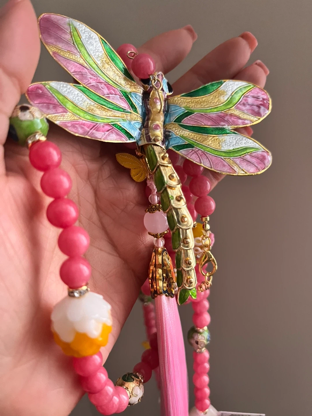 Chinese Intangible Heritage A colourful necklace featuring a detailed dragonfly charm and pink beaded strands. It's accented with smaller butterfly charms and a pink tassel. The beads include pink jade, white floral, and yellow spheres.