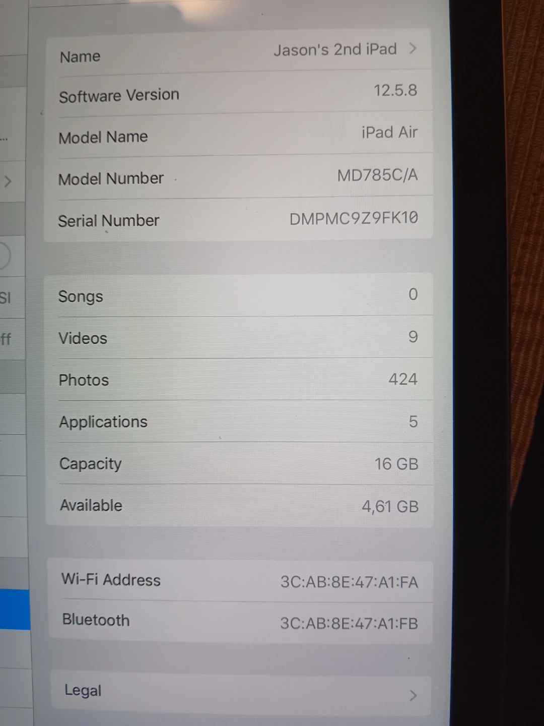 This is an Apple iPad Air with 16GB of storage. It's a silver model running software version 12.5.8. It comes with a digital display and Wi-Fi capability. It's an older unit and the battery lasts for an hour or so when not plugged in. Great for everyday use!