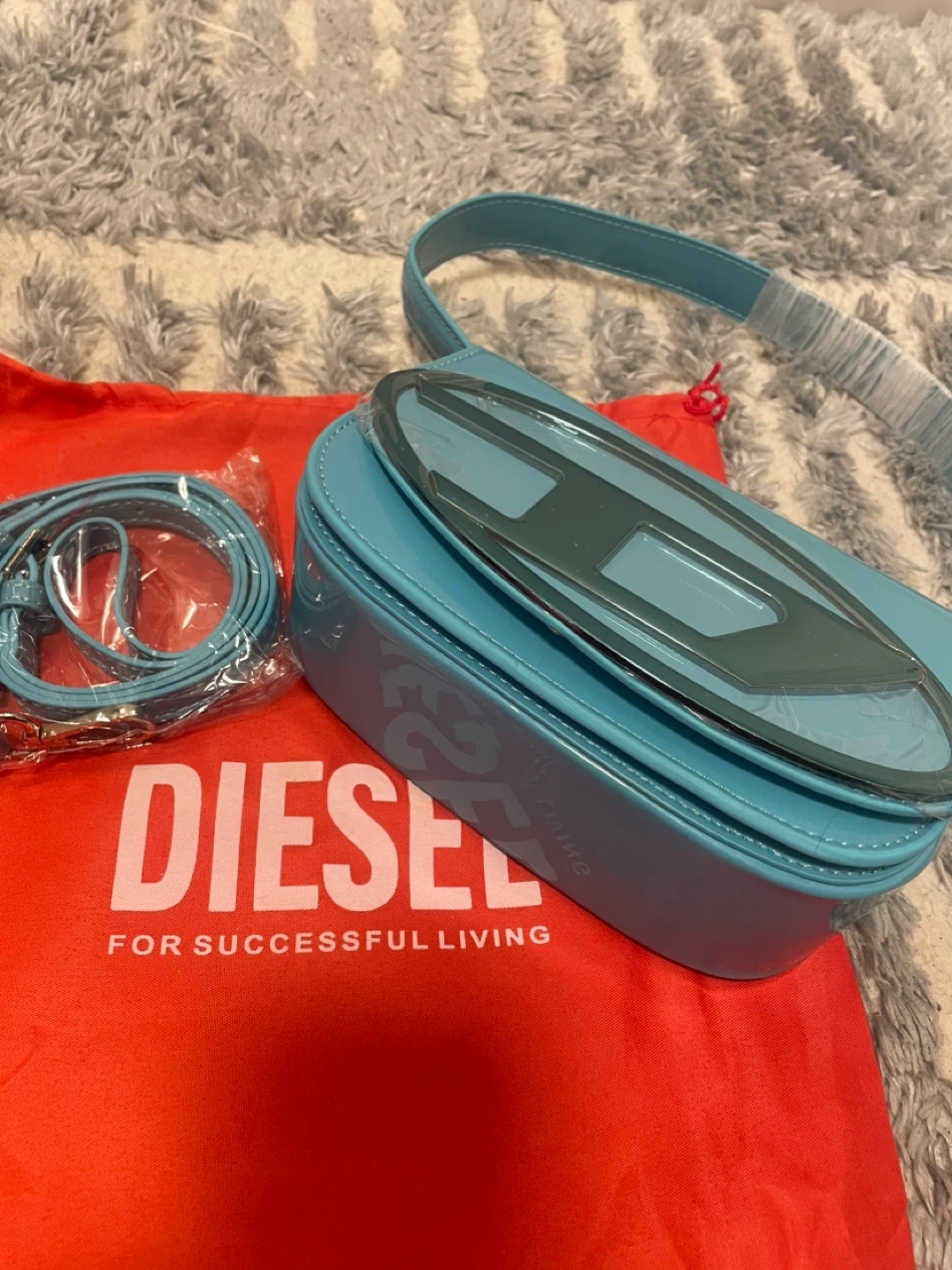 This is a bright blue patent leather shoulder bag by Diesel. It comes with a matching dust bag for storage. The bag features the signature Diesel 'D' logo on the front.