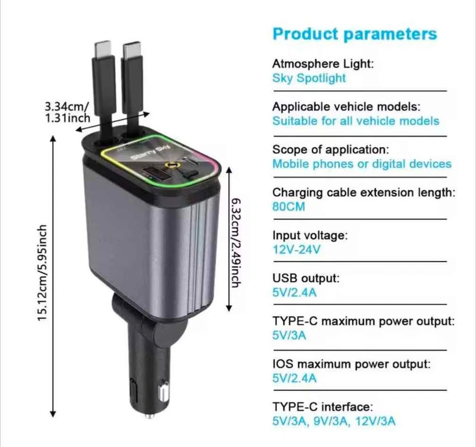 Brand new 4-in-1 car charger with a cool starry sky spotlight feature. It's retractable and offers fast charging for your devices. Includes Type C + Lightning cables, each up to 80cm long. Compatible with iPhones 16/15/14/13/12/11 series and Android phones. Offers 66W max wattage with PD 30W super fast charging via Type-C. Pickup in Hamilton, ON.