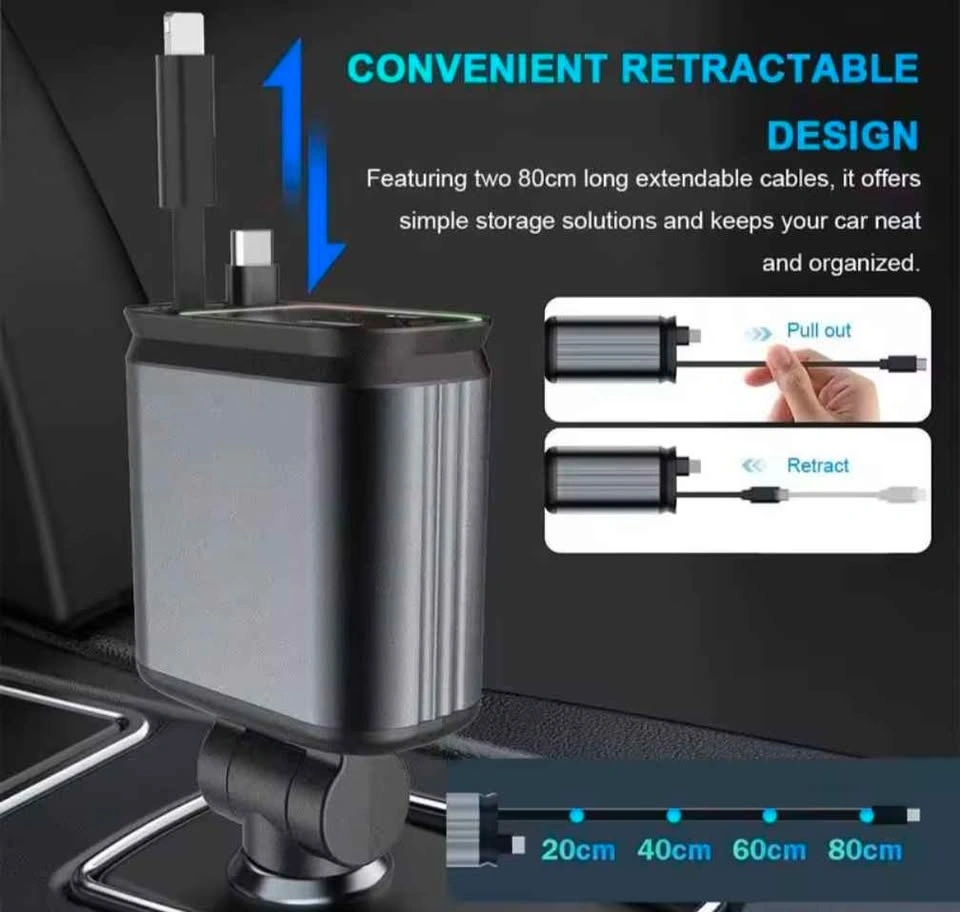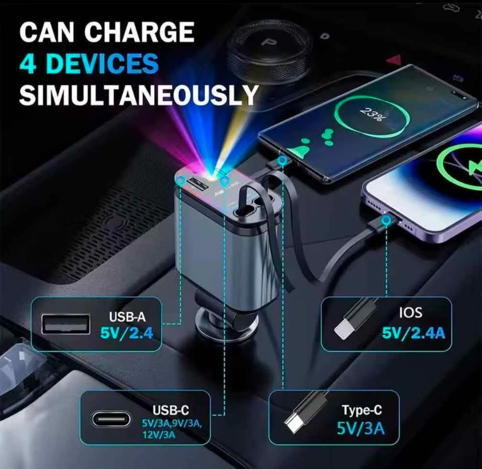 Brand new 4-in-1 car charger with a cool starry sky spotlight feature. It's retractable and offers fast charging for your devices. Includes Type C + Lightning cables, each up to 80cm long. Compatible with iPhones 16/15/14/13/12/11 series and Android phones. Offers 66W max wattage with PD 30W super fast charging via Type-C. Pickup in Hamilton, ON.