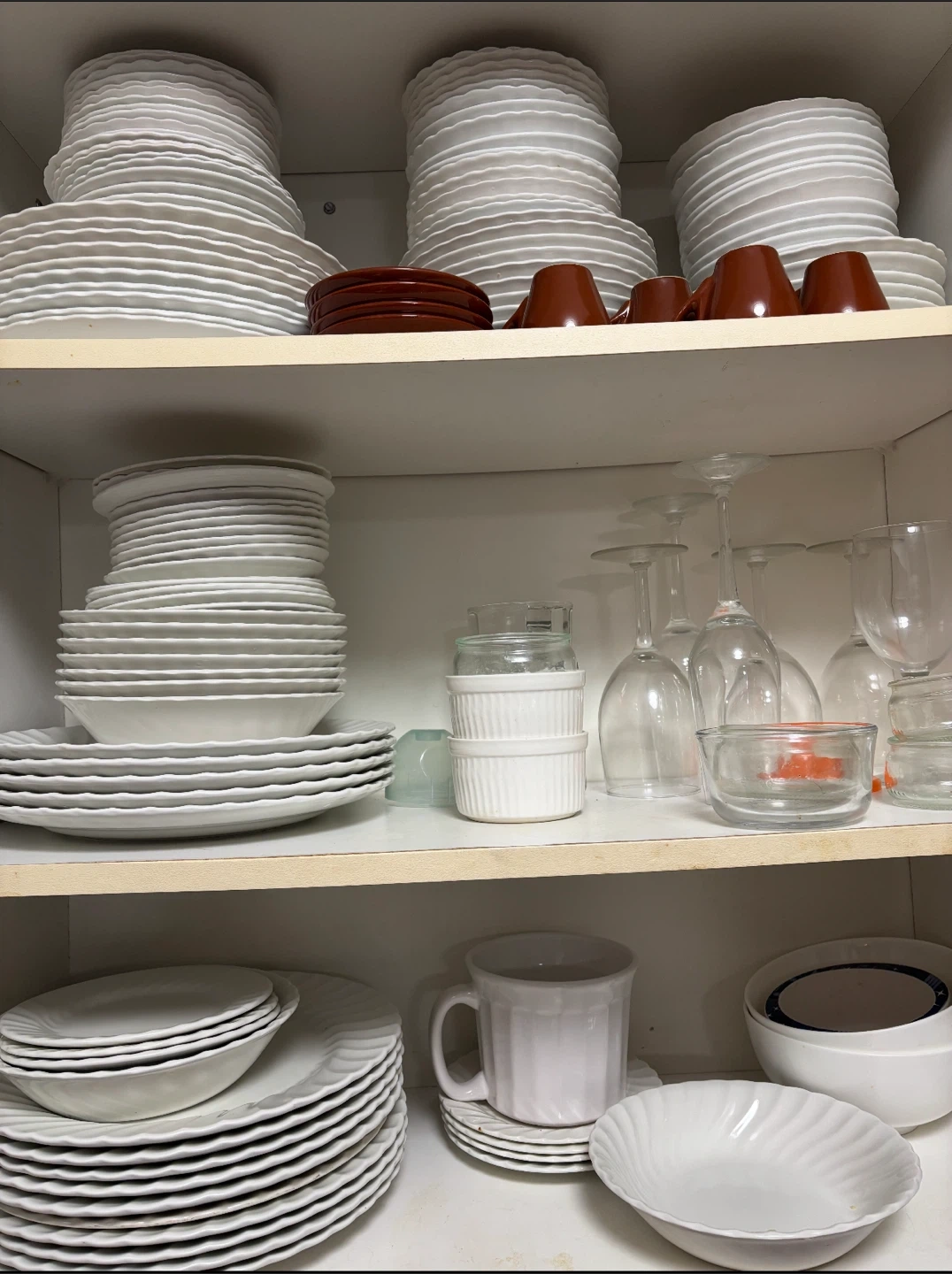 White ceramic plates and bowls. Includes various sizes of dinner plates, salad plates, and serving bowls. A classic and versatile set for any kitchen full set brand new.