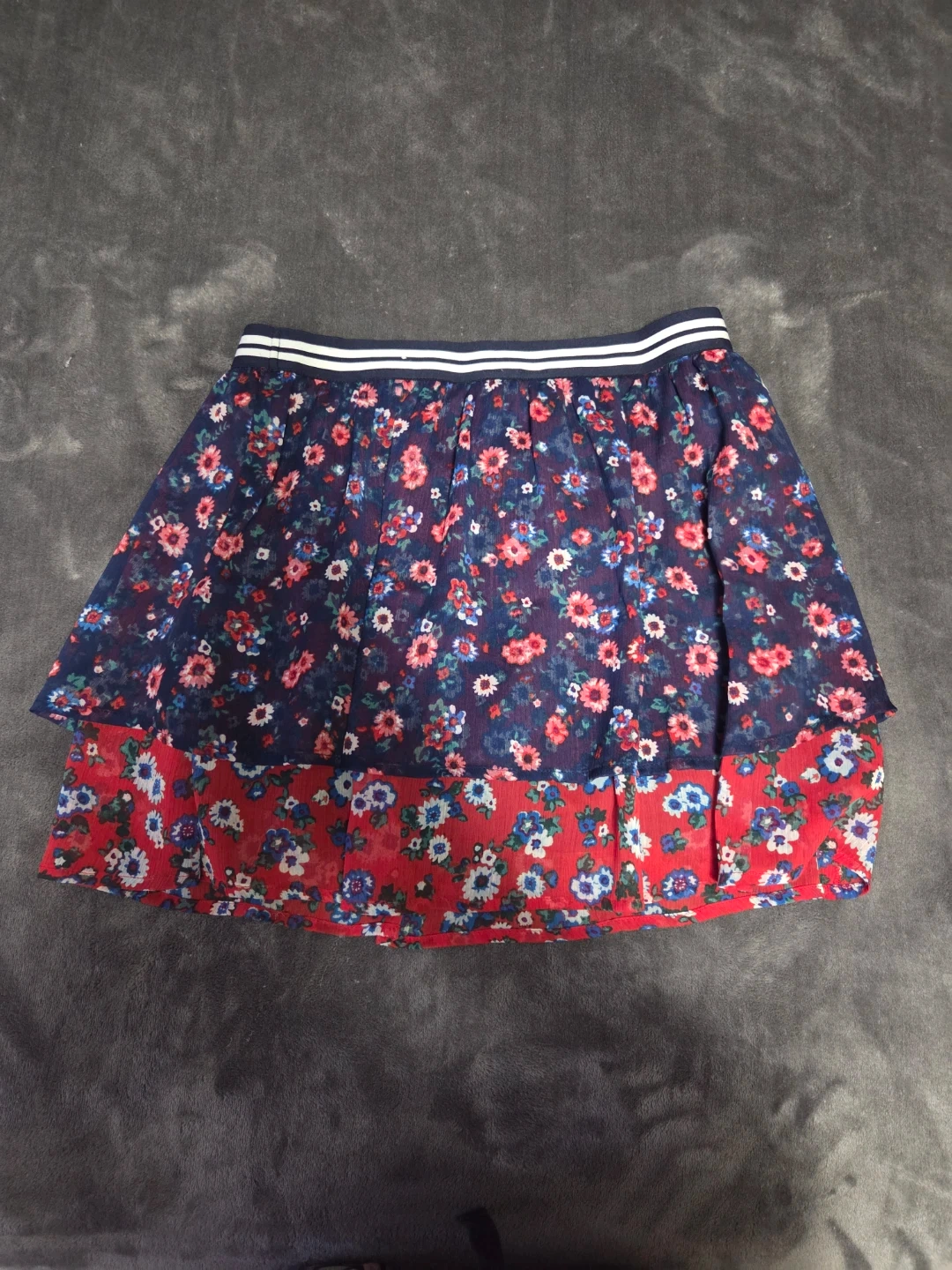 This fun Justice skirt features a navy blue top layer with a floral print and a red bottom layer also with a floral pattern. It has a comfy elastic waistband with white stripes. Perfect for everyday wear or dressing up!