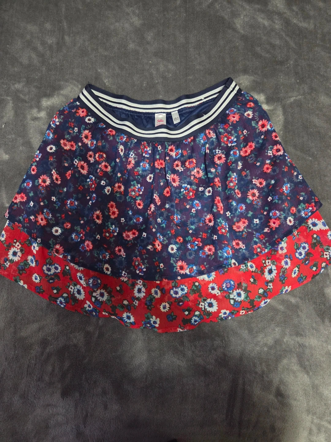This fun Justice skirt features a navy blue top layer with a floral print and a red bottom layer also with a floral pattern. It has a comfy elastic waistband with white stripes. Perfect for everyday wear or dressing up!