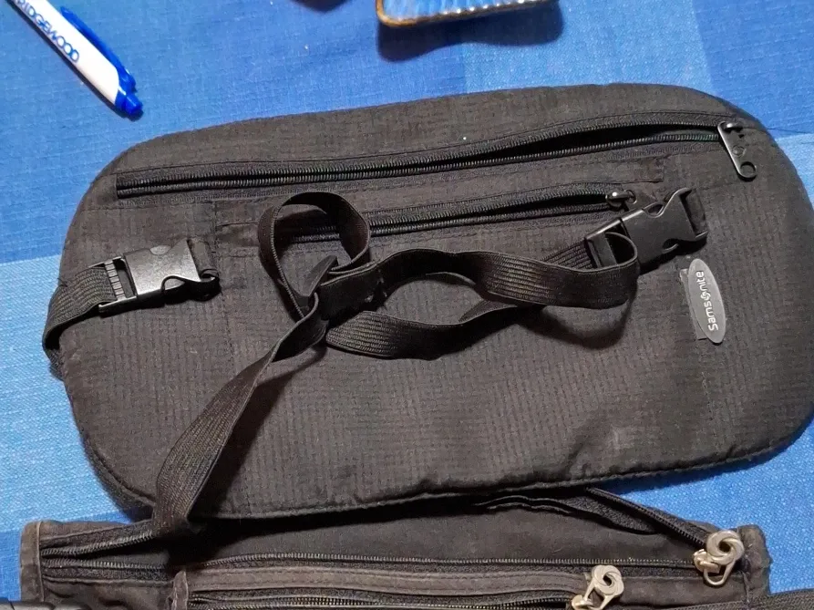 This is a black travel waist pack from Samsonite. It features multiple zippered compartments for organization. The adjustable strap has a buckle closure.