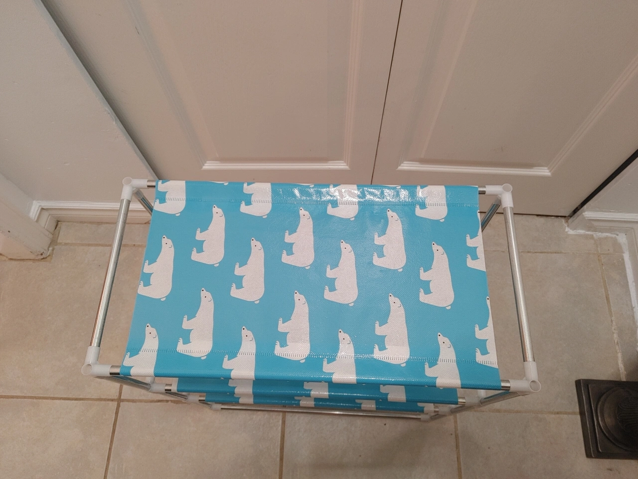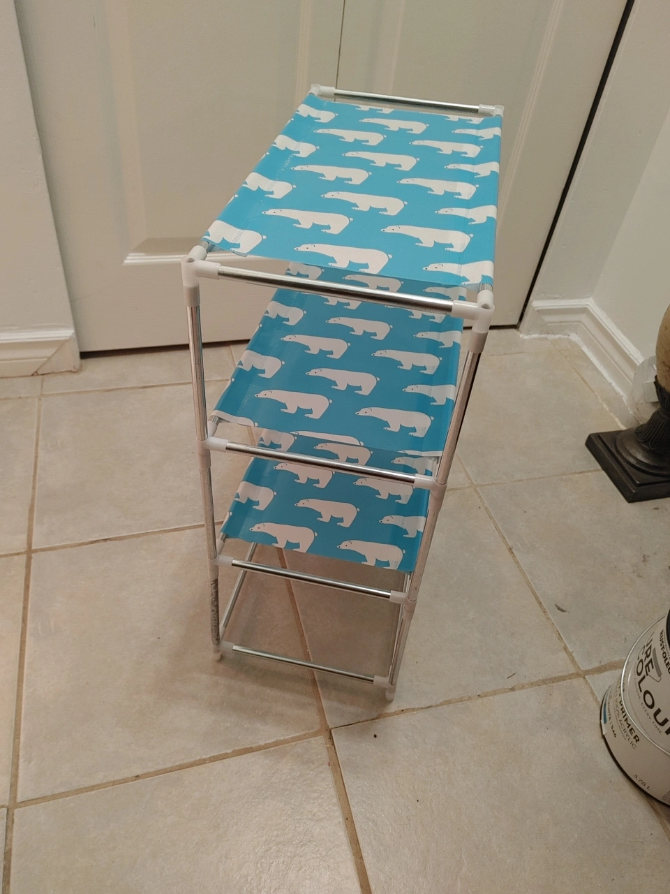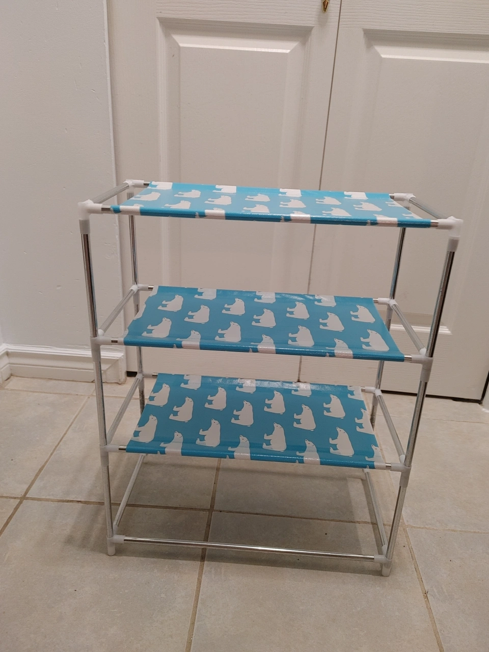 This is a 3-tier storage shelf with a cute polar bear print on a light blue background. It's great for organizing small items or shoes.