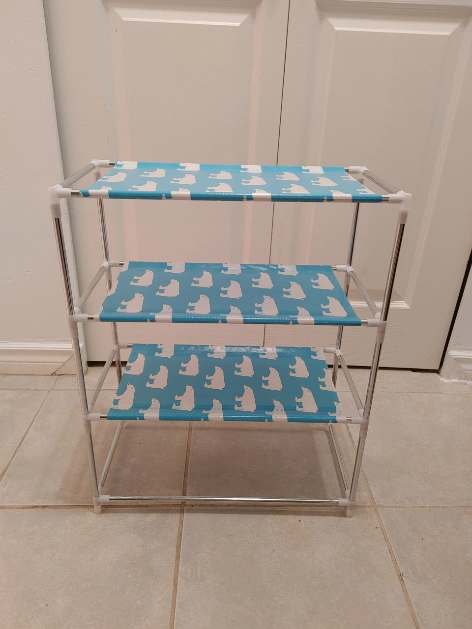 This is a 3-tier storage shelf with a cute polar bear print on a light blue background. It's great for organizing small items or shoes.