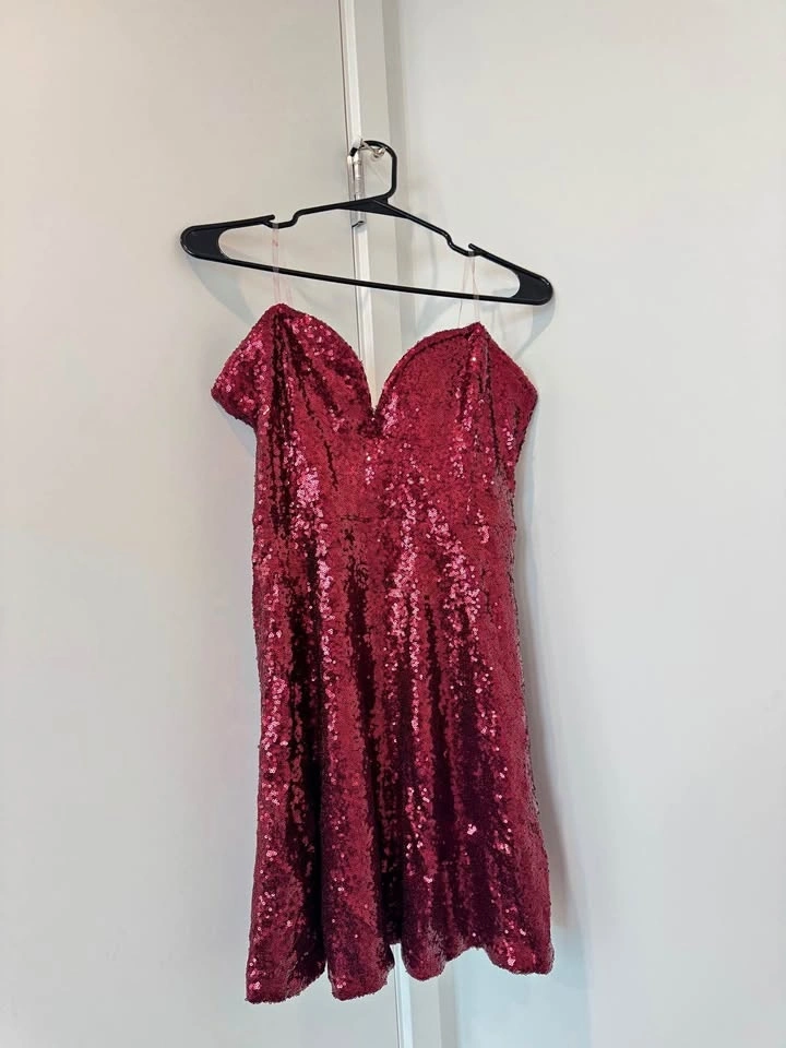 This stunning red party dress is perfect for any special occasion. It features a flattering A-line silhouette and delicate lace detailing. Worn only once, it's in excellent condition and ready for its next event.