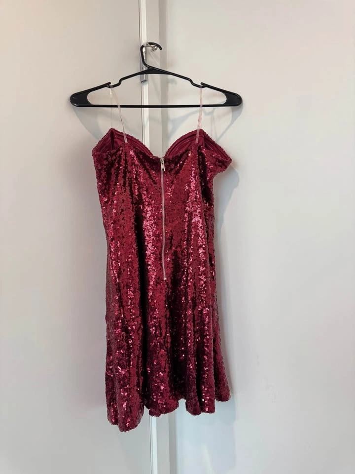 This stunning red party dress is perfect for any special occasion. It features a flattering A-line silhouette and delicate lace detailing. Worn only once, it's in excellent condition and ready for its next event.