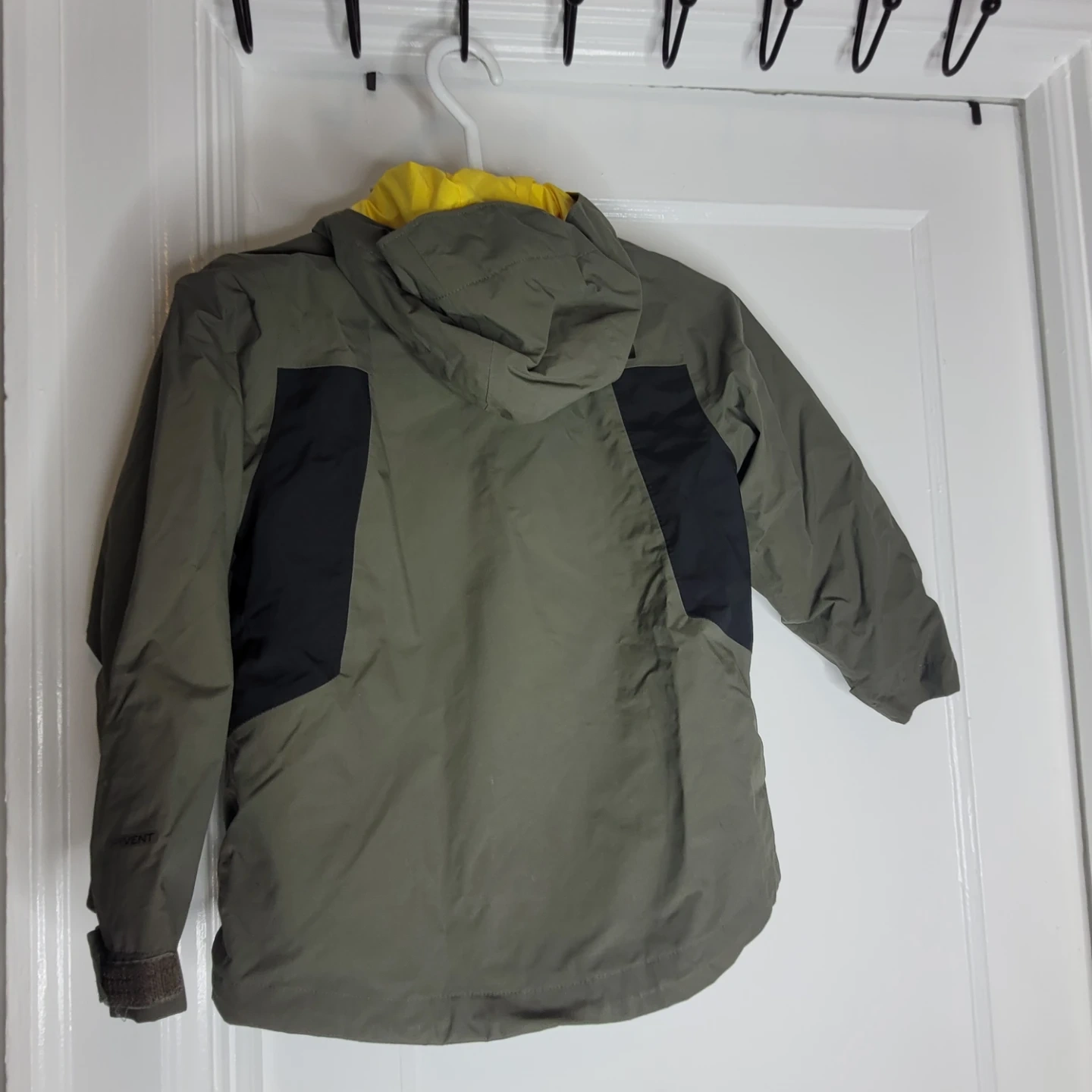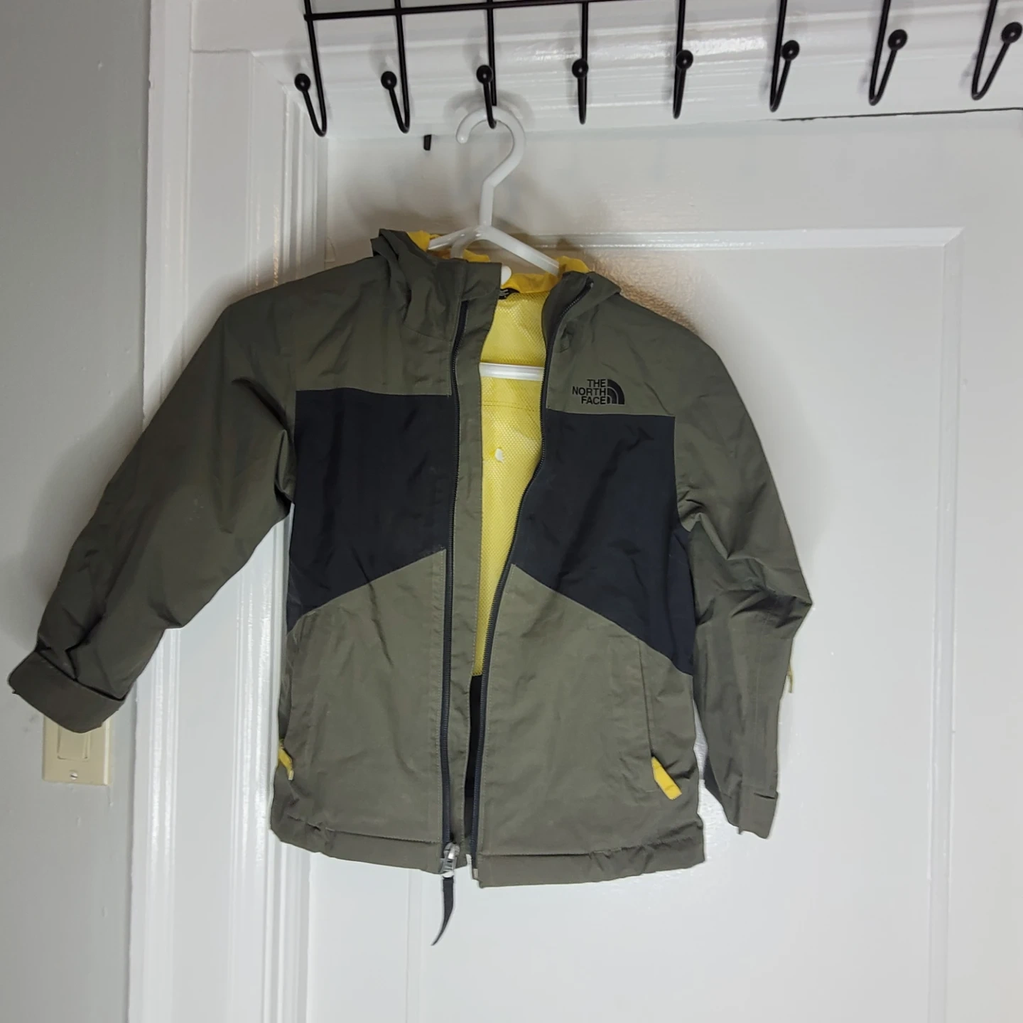 This is a boy's jacket from The North Face. It's a size 6/XS/TP and features a two-tone design with olive green, black, and yellow accents. The jacket has a hood and a zippered front. It's made for active wear.