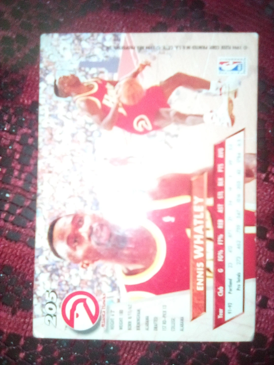 This is a 1992 Ultra basketball card featuring Ennis Whatley of the Atlanta Hawks. Card number 205. It has player stats on the back.