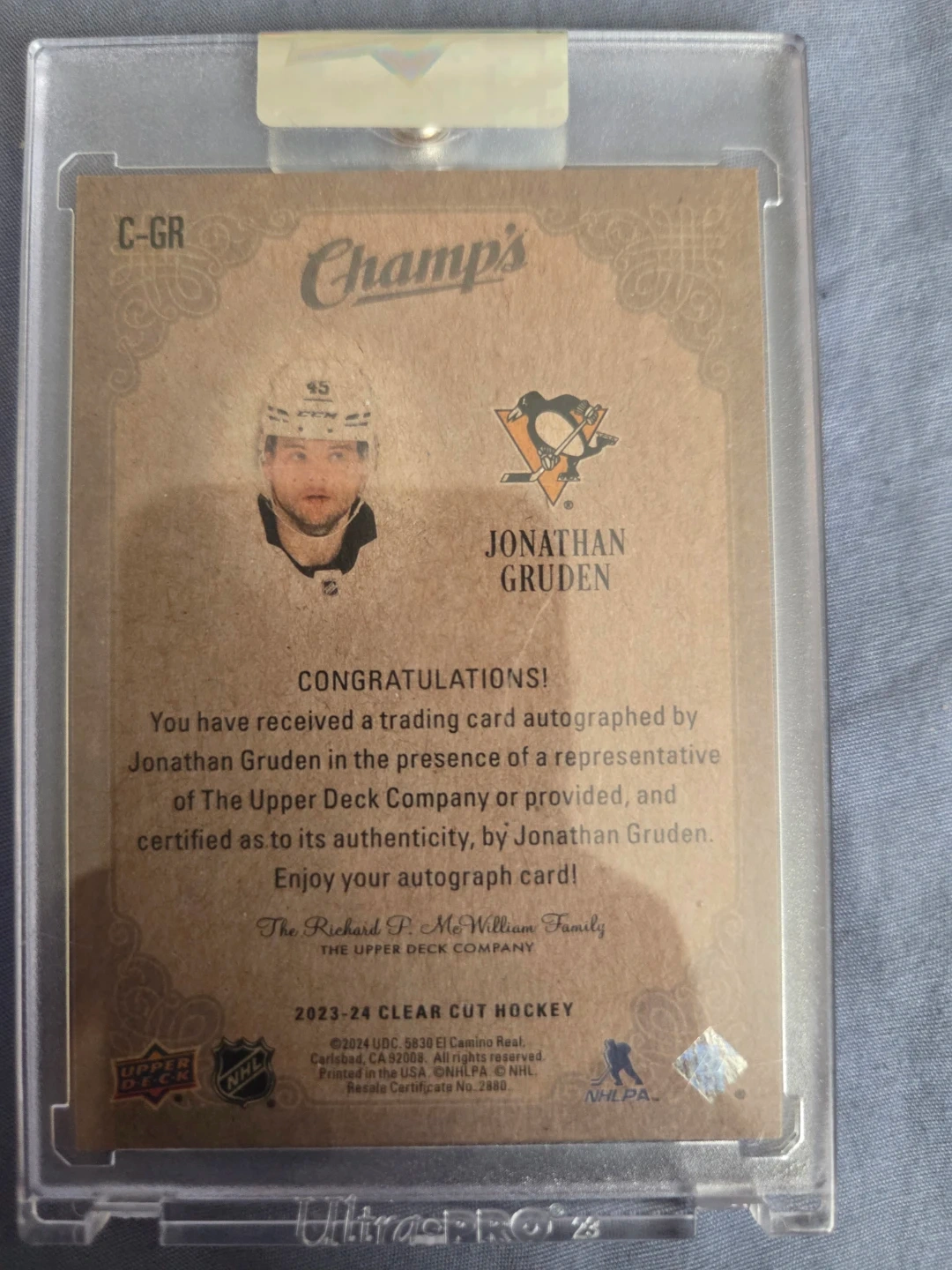 This is a 2023-24 Upper Deck Champs Clear Cut Hockey trading card featuring an autograph from Jonathan Gruden. It's a rookie card and has been certified for authenticity by Upper Deck. It's a great collectible for hockey fans!