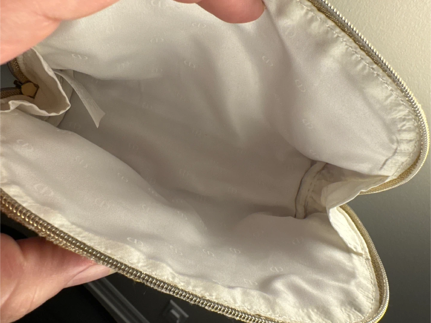 DIOR cosmetic pouch in a shimmery gold textured fabric. It features a zip closure and a decorative "CD" logo charm with a star accent. The interior is lined with white fabric embossed with "CD" logos. Great for organizing makeup or small essentials!