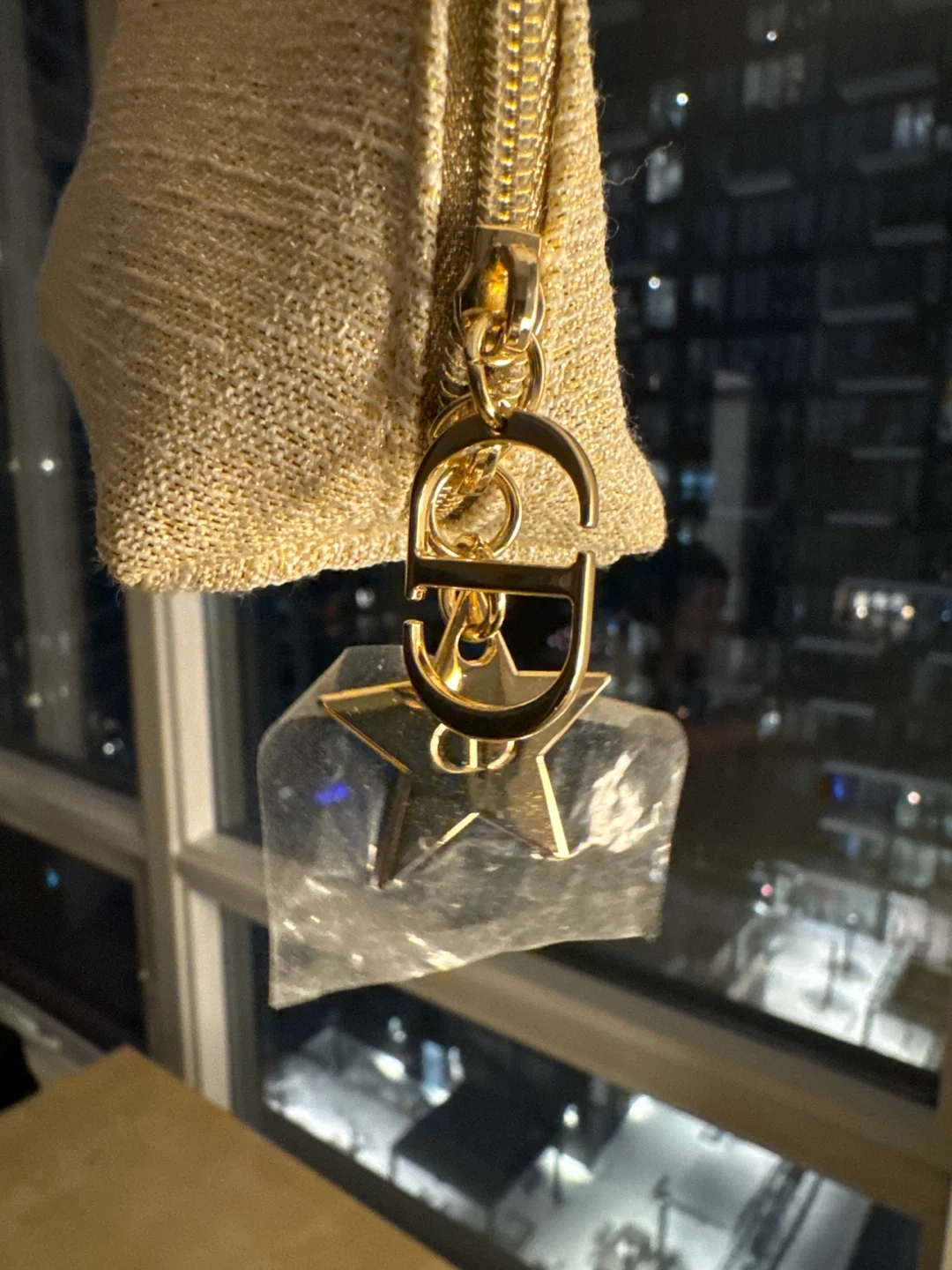 DIOR cosmetic pouch in a shimmery gold textured fabric. It features a zip closure and a decorative "CD" logo charm with a star accent. The interior is lined with white fabric embossed with "CD" logos. Great for organizing makeup or small essentials!