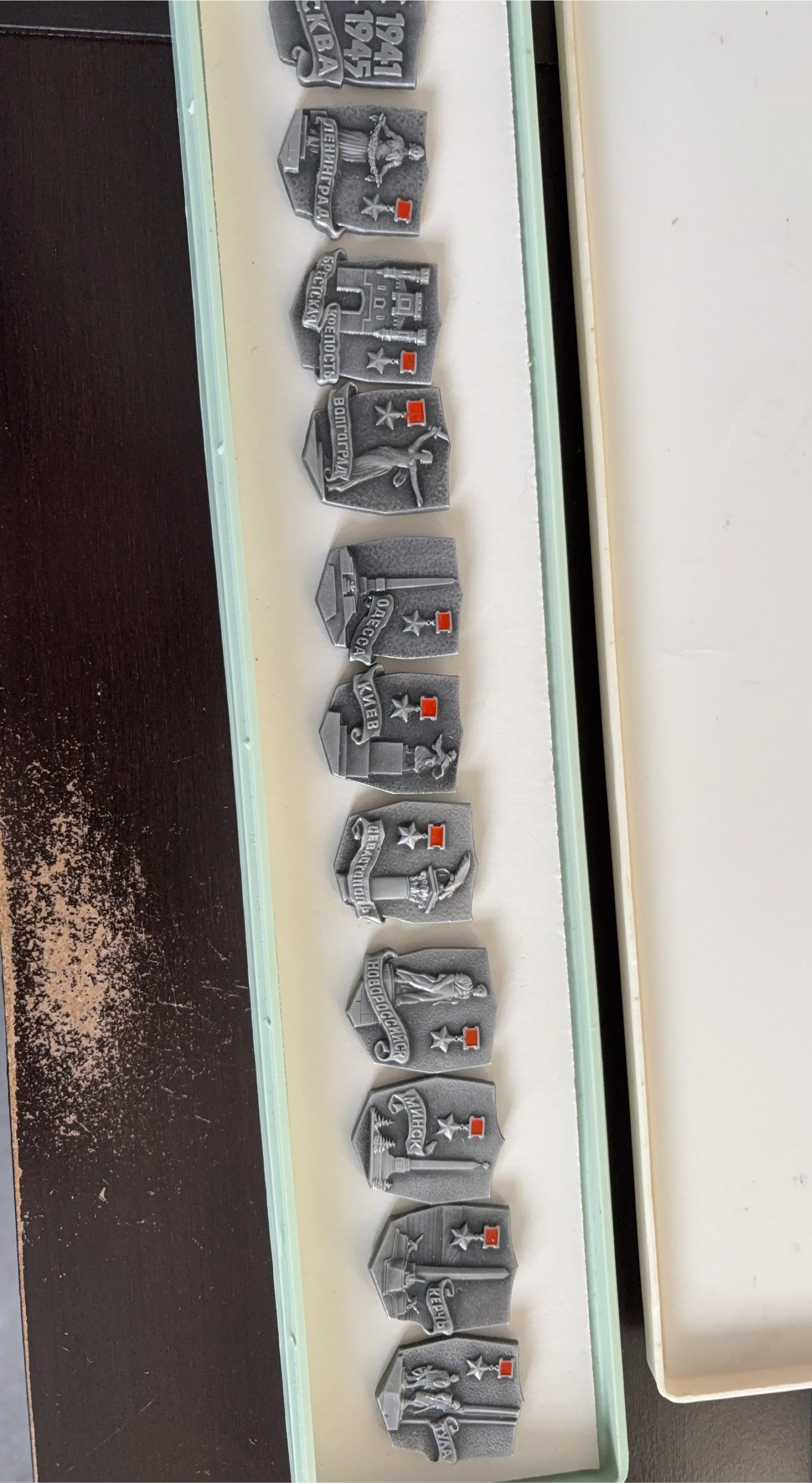 This is a collection of 10 collectible pins, each featuring different Soviet cities and dates, likely related to World War II. They appear to be made of metal with red enamel accents. These pins represent significant locations and time periods. They're great for collectors interested in military history.