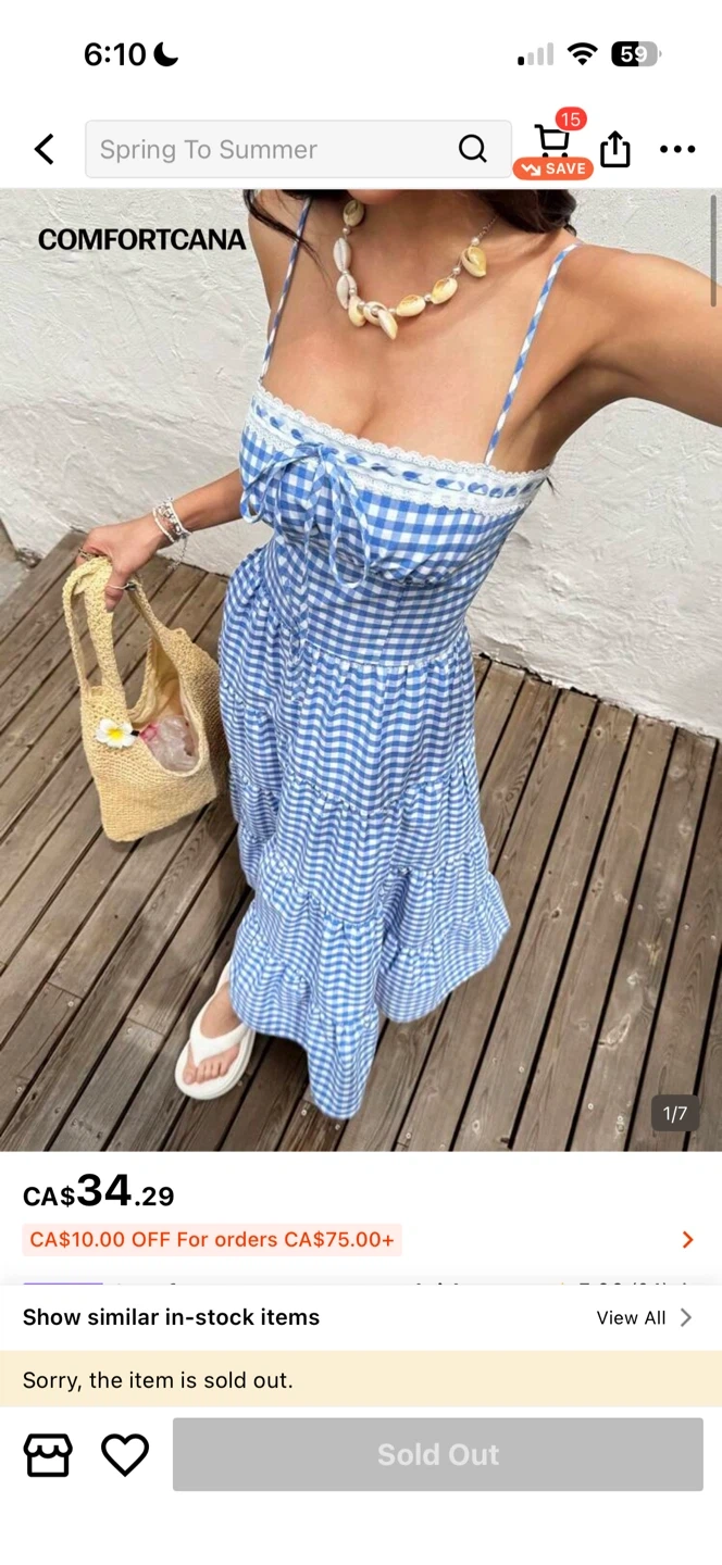 This COMFORTCANA dress features a blue gingham pattern. It's a tiered maxi dress with a lace trim. Looks great for summer outings!