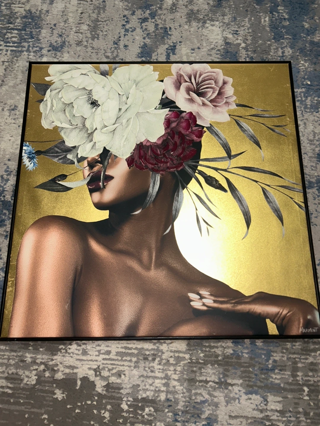 Beautiful Marmont framed canvas wall art featuring a gold textured background with a floral portrait design. Very stylish piece that looks great in a living room, bedroom, or hallway.