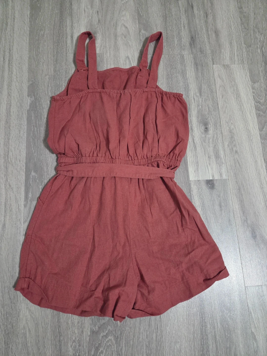 This girls' romper is a lovely red colour. It has a cinched waist with a tie and two pockets on the front. This is a great piece for warm weather!