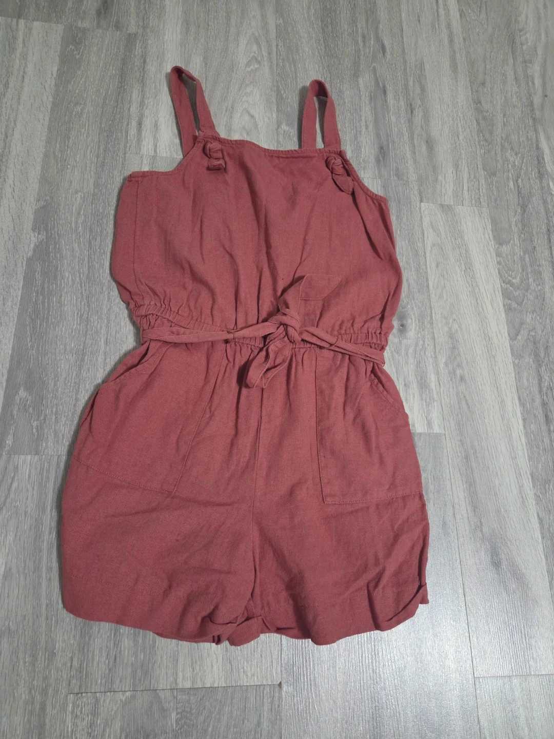 This girls' romper is a lovely red colour. It has a cinched waist with a tie and two pockets on the front. This is a great piece for warm weather!