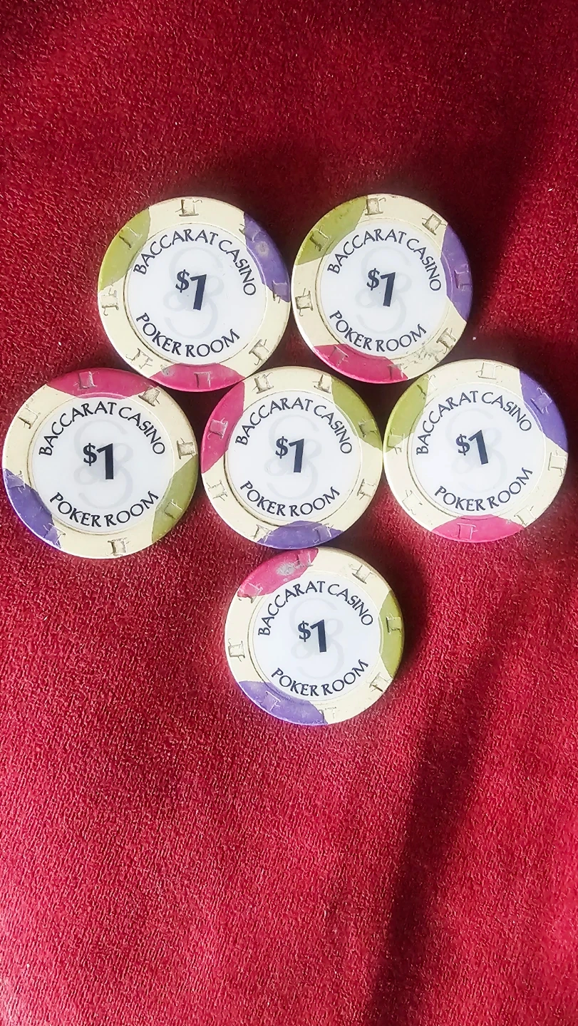 Set of six $1 poker chips from the OLD Baccarat Casino in Edmonton. The Baccarat closed and was demolished in 2020.