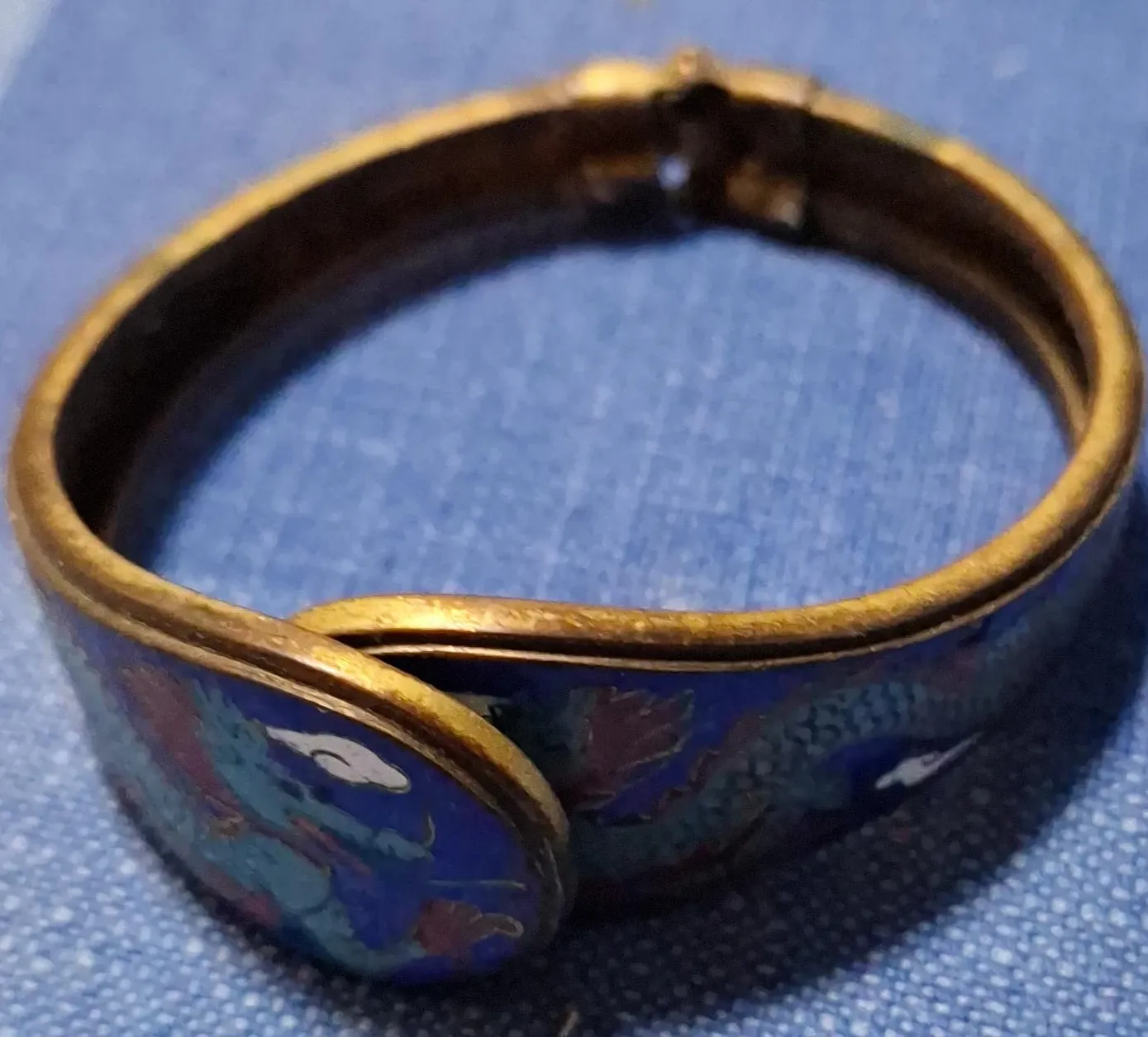 This vintage bangle bracelet features a blue enameled design with intricate dragon motifs. It has a hinged clasp for easy wear. The metal appears to be brass or a similar alloy.