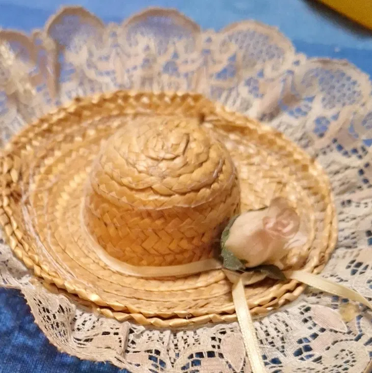 This is a charming miniature straw hat. It's adorned with delicate lace trim and a small fabric flower. It looks like it's made from woven straw. Perfect for dolls or decorative crafts!