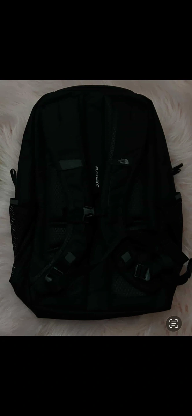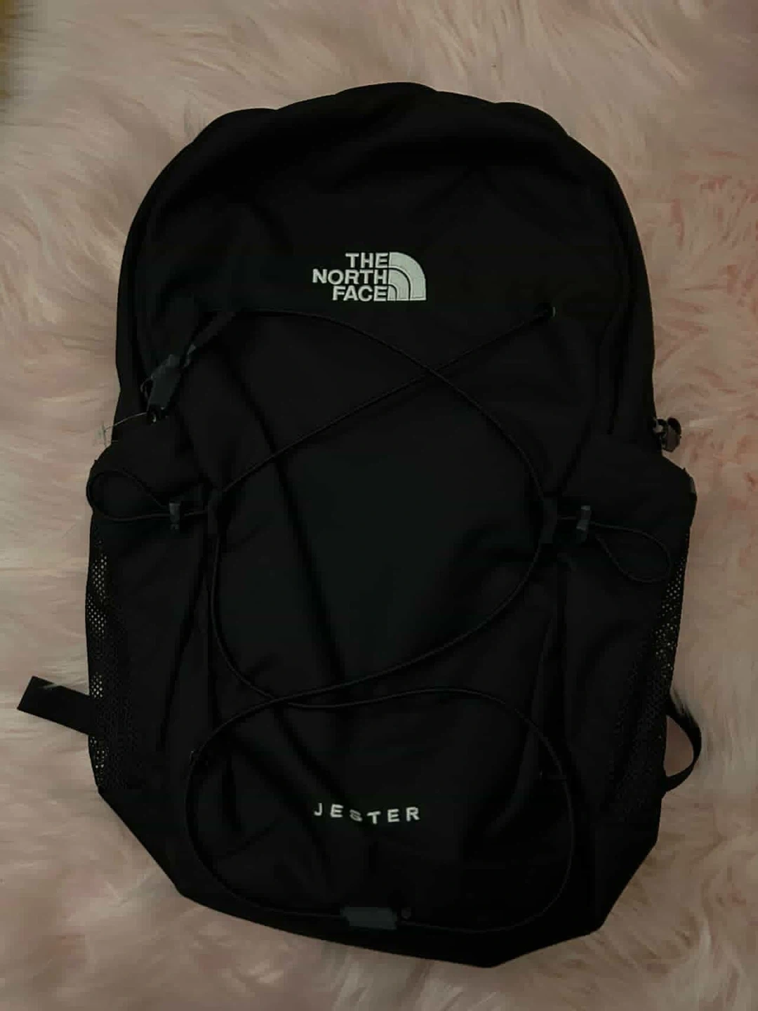 This is The North Face Jester backpack. It's black and perfect for everyday use. It features multiple compartments and side mesh pockets for water bottles.