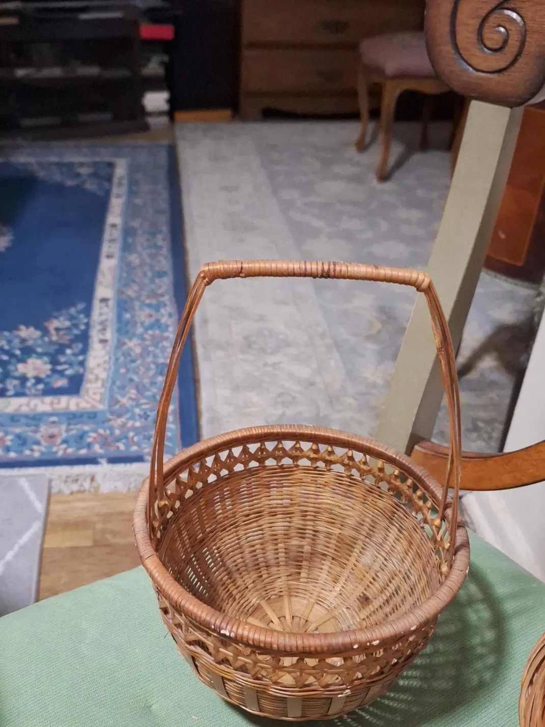 This is a charming wicker basket. It's made of natural woven material. It features a sturdy handle for easy carrying. This basket is perfect for decorative storage or seasonal displays!