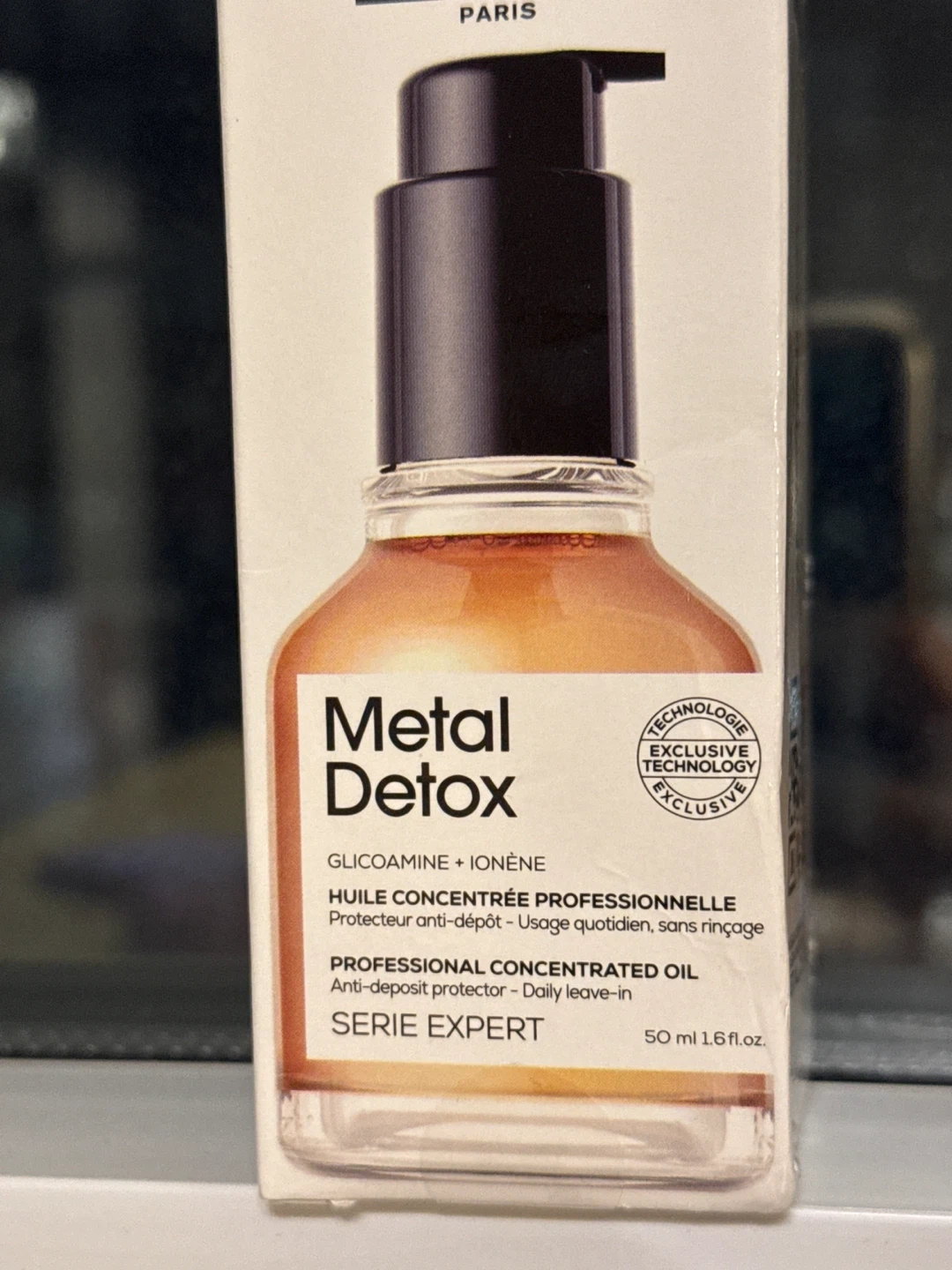 L'Oréal Professionnel Metal Detox Professional Concentrated Oil. This leave-in treatment protects hair from oxidative colouring, balayage, and lightening services. It's designed to neutralize metal inside the fibre and helps protect hair up to 230°C/450°F. It's a leave-in treatment for daily use. (unopened and in original packaging, 50 ML)