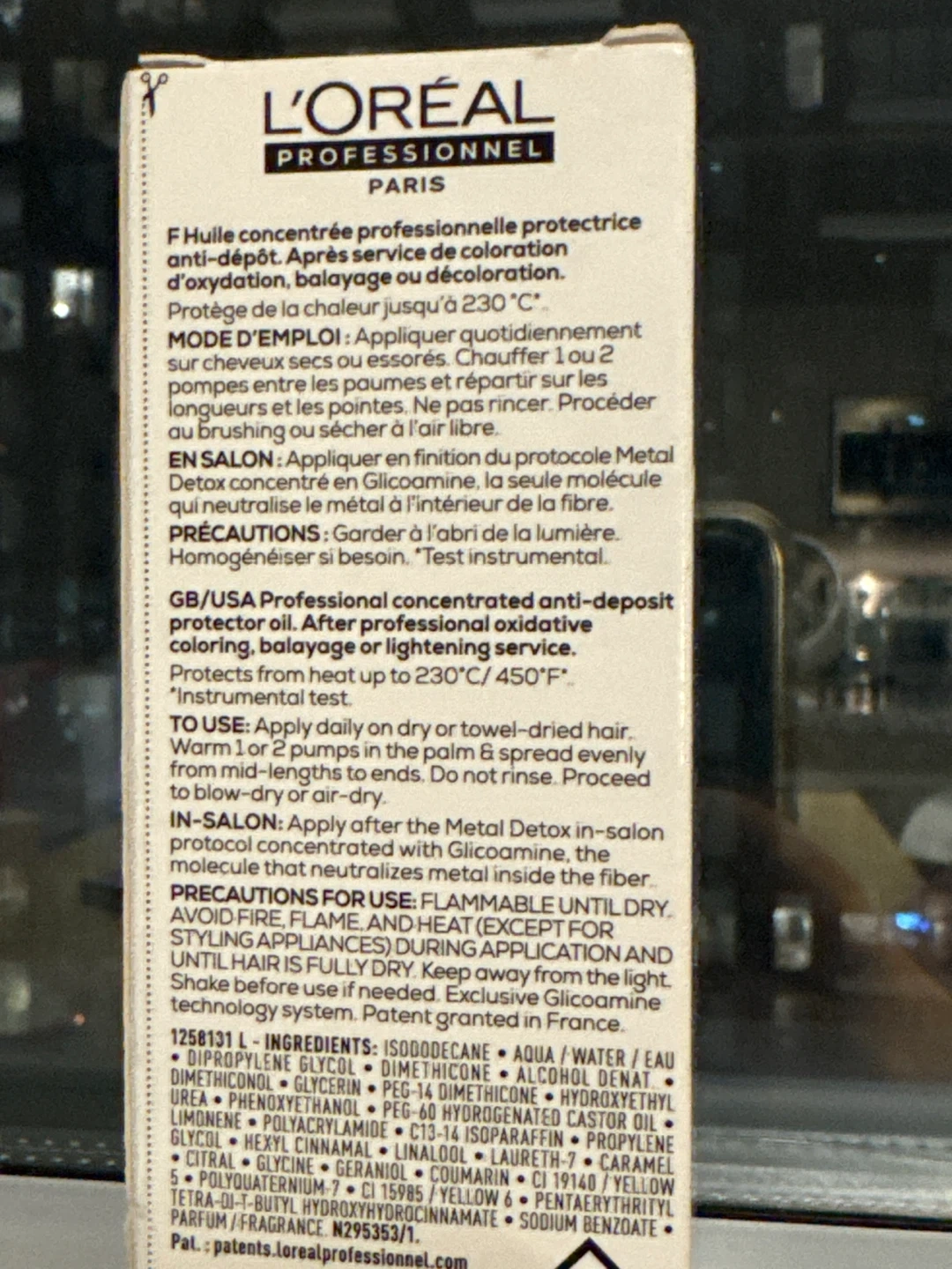 L'Oréal Professionnel Metal Detox Professional Concentrated Oil. This leave-in treatment protects hair from oxidative colouring, balayage, and lightening services. It's designed to neutralize metal inside the fibre and helps protect hair up to 230°C/450°F. It's a leave-in treatment for daily use. (unopened and in original packaging, 50 ML)