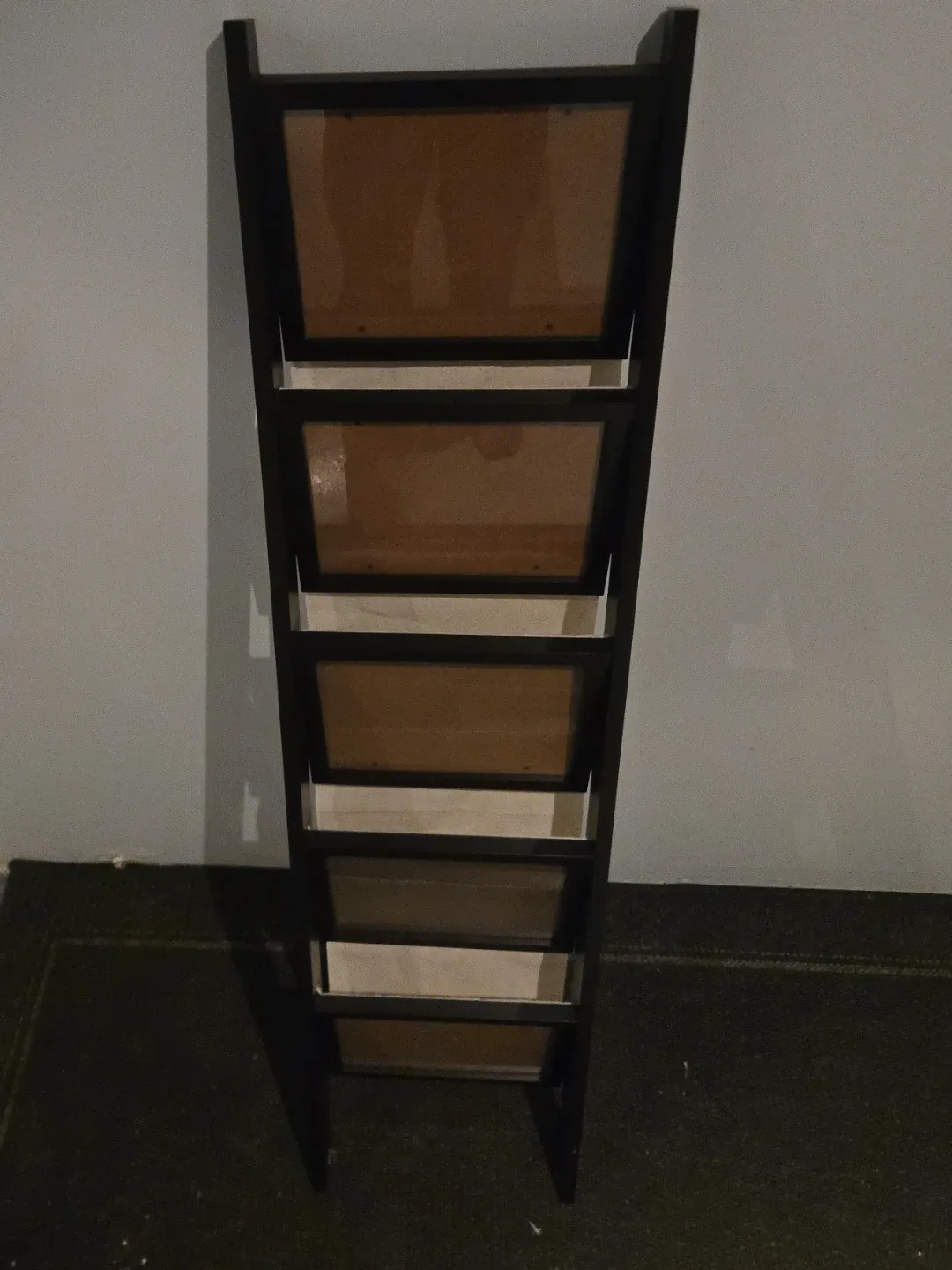 This is a black 5-tier magazine rack. It's made of wood with a black finish. The shelves are angled for easy viewing of contents. It's suitable for holding magazines or displaying brochures.