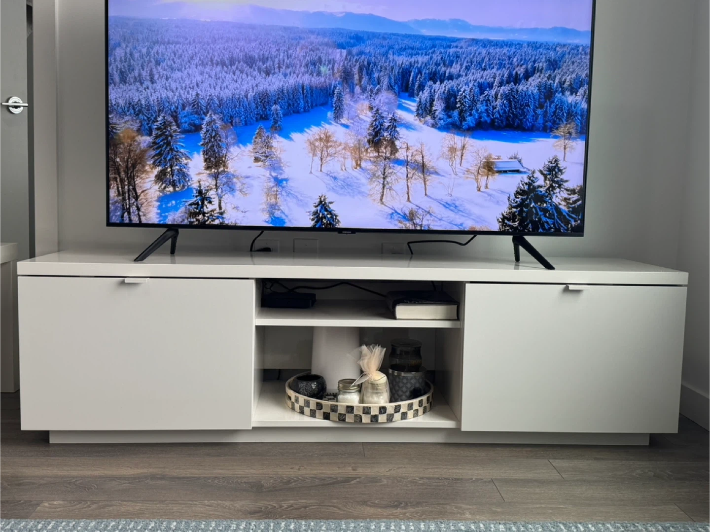 IKEA TV stand in white, modern and minimal design. Used with care in a smoke-free, pet-free home. Clean, sturdy, and in excellent condition with smooth drawers and ample storage for media devices. No damage or scratches. Perfect for a clean, contemporary living space. Please DM if interested only.