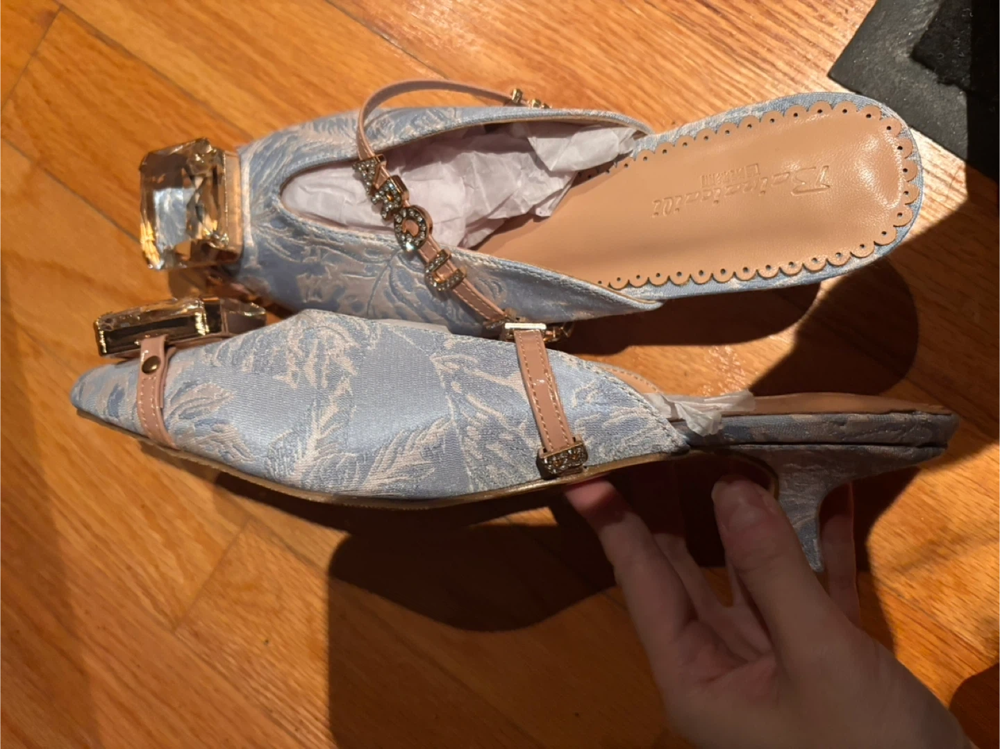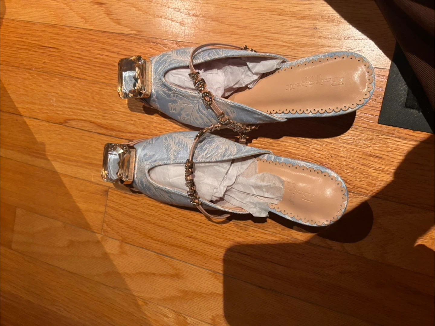 These stylish blue mules feature a delicate floral pattern and a large jewelled accent on the toe. They have a pointed toe and a low kitten heel. A dainty strap with buckle closure is attached across the vamp. Size is 35 euro