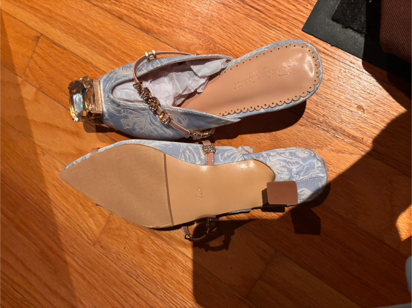 These stylish blue mules feature a delicate floral pattern and a large jewelled accent on the toe. They have a pointed toe and a low kitten heel. A dainty strap with buckle closure is attached across the vamp. Size is 35 euro
