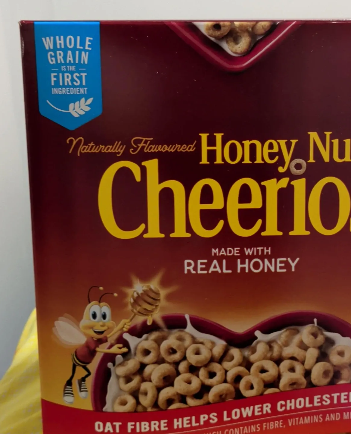 Naturally flavoured Honey Nut Cheerios. Whole grain is the first ingredient. Made with real honey. Oat fibre helps lower cholesterol.