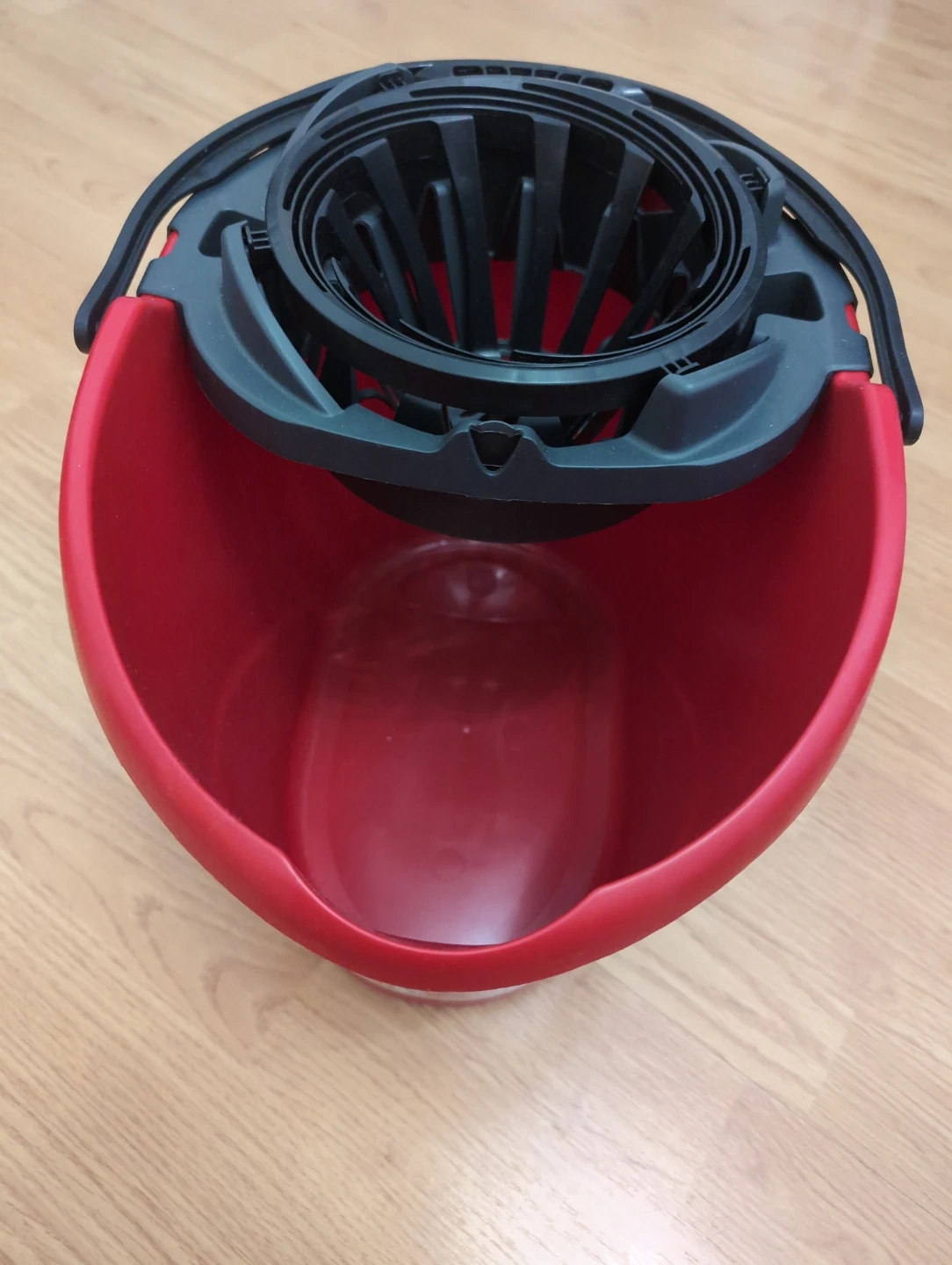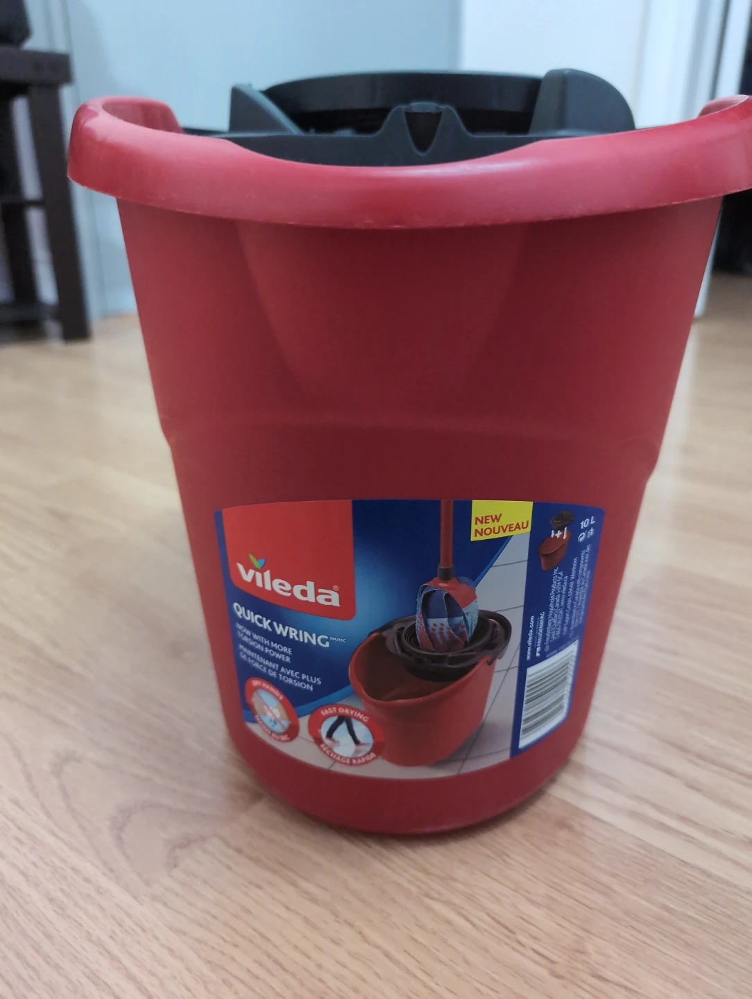 This Vileda mop bucket is red and has a 10L capacity. It features a quick wringing system for easy use. Plastic material, barely used.