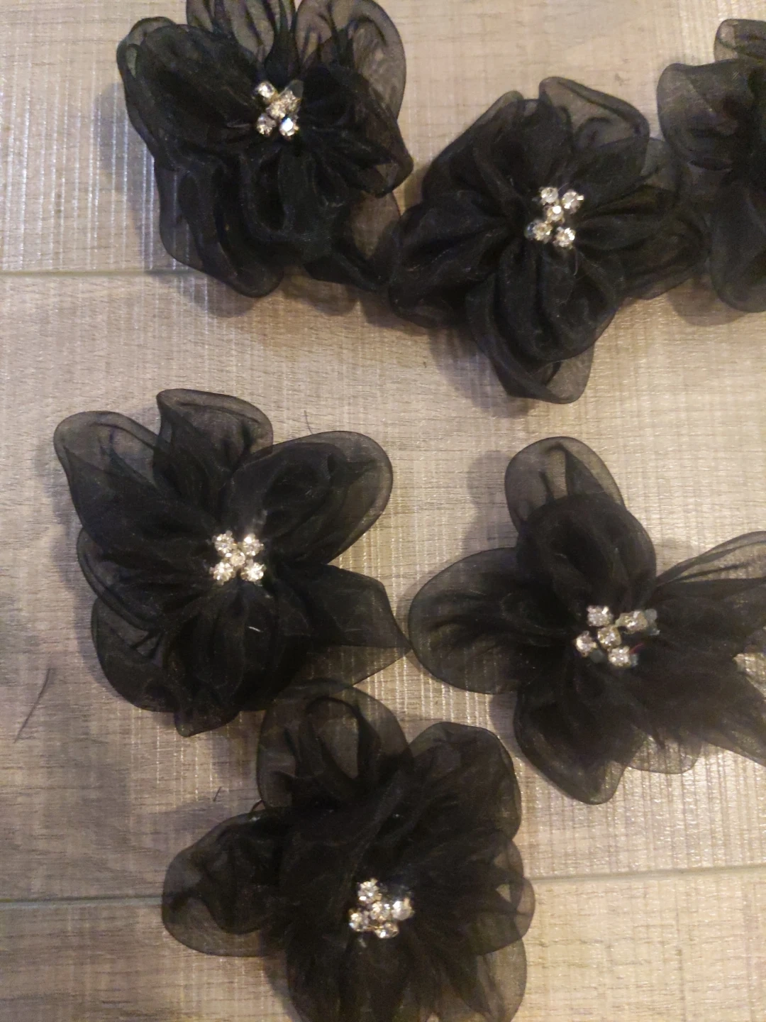 This is a set of seven black organza flower appliques, each with a sparkling rhinestone centre. They're about 2-3 inches in diameter. Great for crafts, sewing, or decorating accessories!