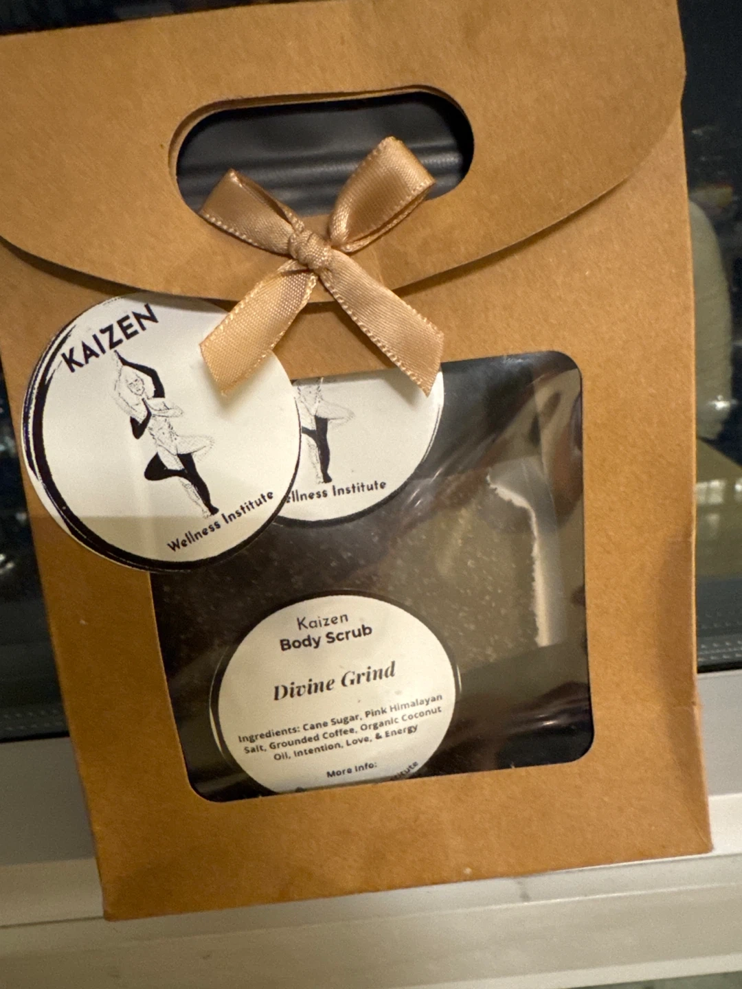 This is the Kaizen Divine Grind Body Scrub. It's made with cane sugar, pink Himalayan salt, grounded coffee, and organic coconut oil. It's formulated with intention, love, and energy for your skin.