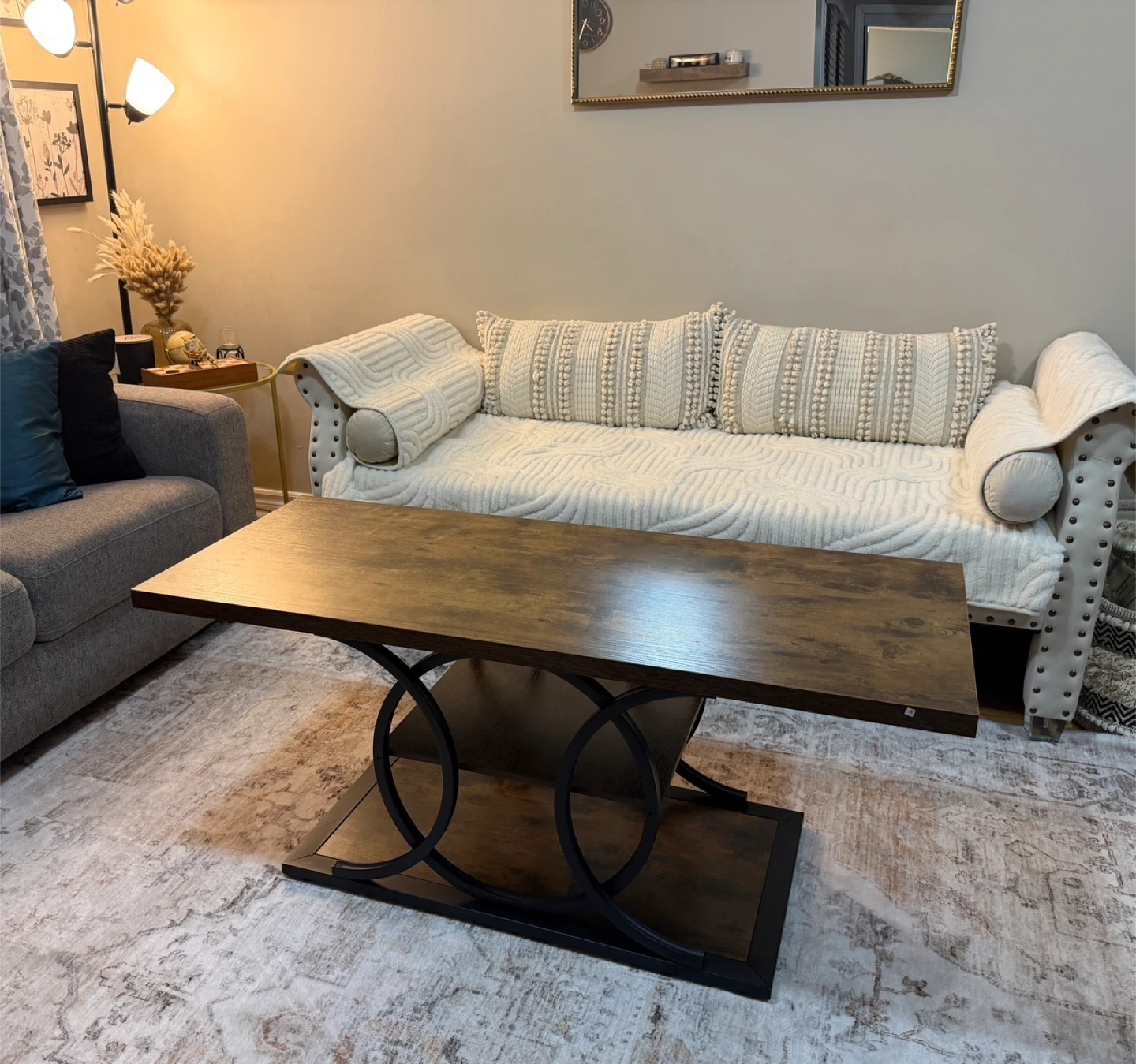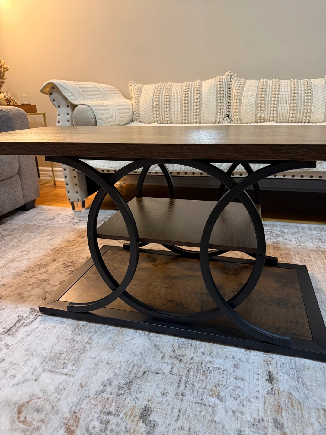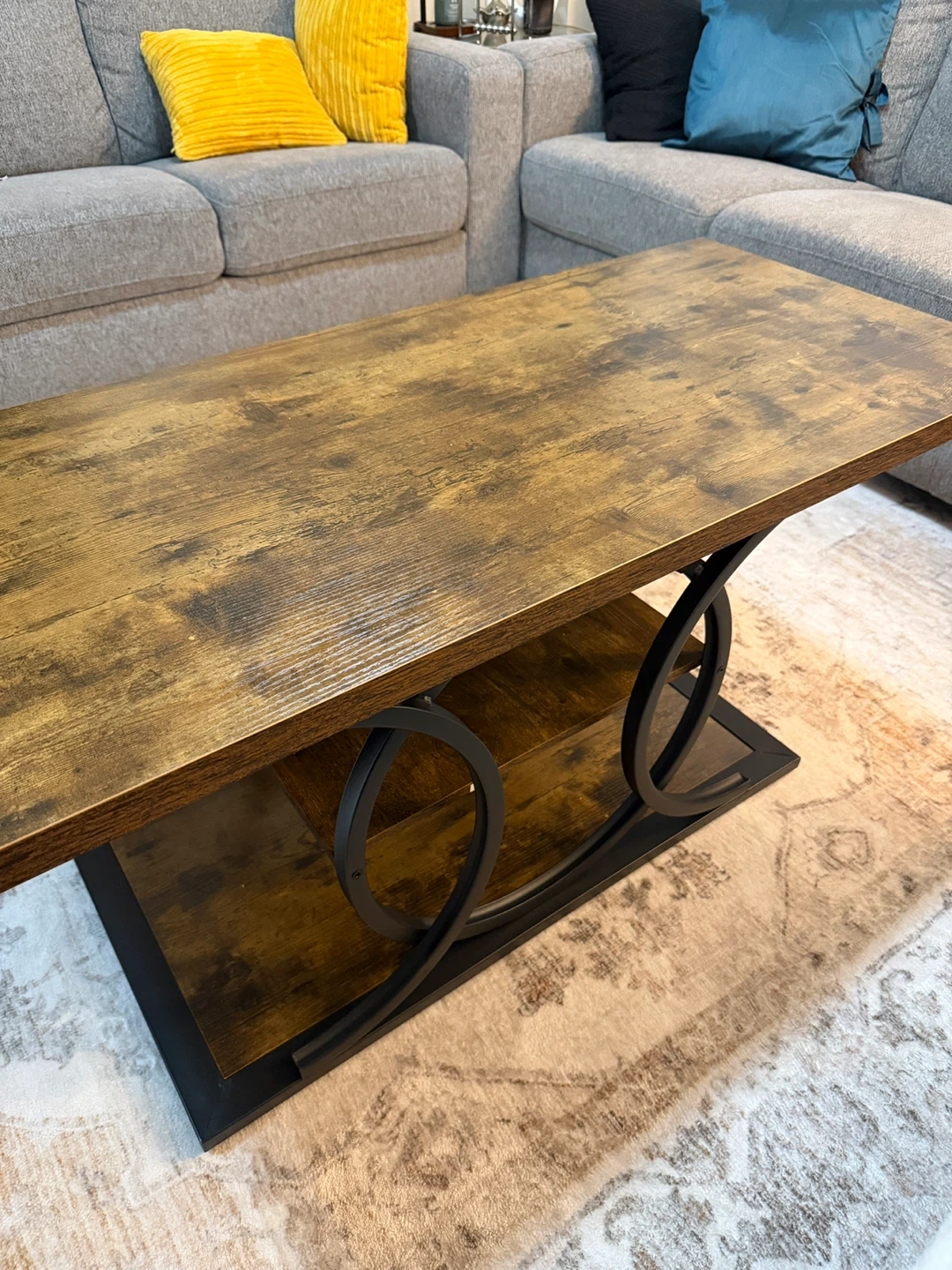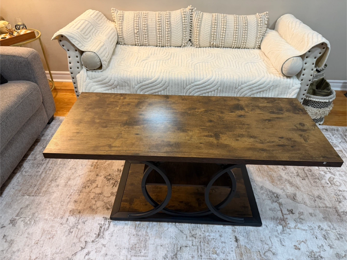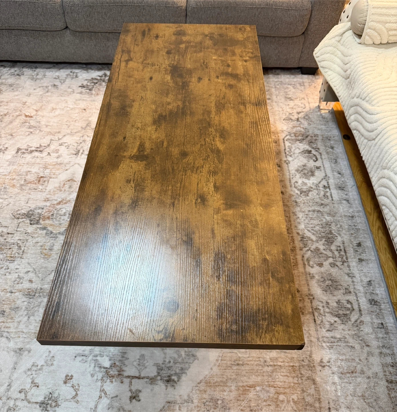 This coffee table is brand new and never used. It was taken out of the box and fully assembled, but never placed into use.